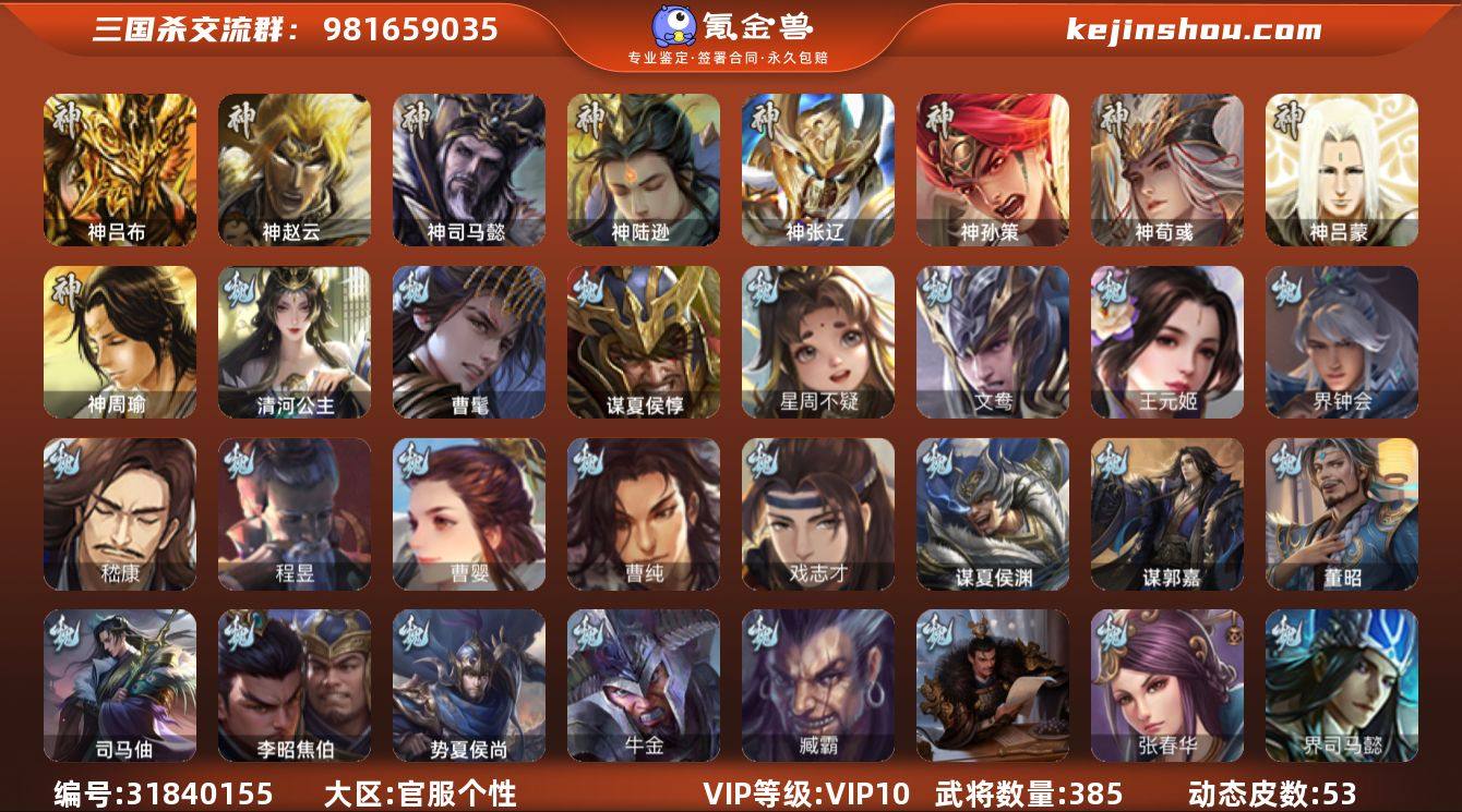 【14789241】官阶:大将军;VIP等级:VIP10;史诗武将数量:46;动态皮肤数量:53;武将总数:385;史诗宝珠数量:0;将魂数量:6556;神将:7;魏国史诗武将:28;蜀国史诗武将:6;吴国史诗武将:8;群史诗武将:16