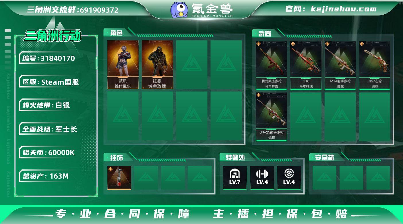 总资产:163M 哈夫币:60000K 烽火地带段位:白银 烽火地带等级:60 全面战场段位:军士长 全面战场等级:50 7级仓库,4级训练中心,4级靶场