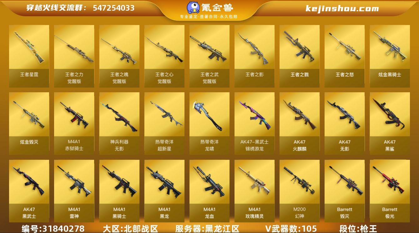 黑龙江区-109V-11王者-3炫金 【热门武器】:QBZ03-金色蔷薇,HK417-朱雀,M200-幻神,死亡之眼,Kar98K-星神,C.A.T,M4A1-黑骑士*2,汤姆逊-烈龙*6,RPK-盘龙*6,加特林-炼狱,USP-雷暴,沙鹰-修罗*4,炽芒蝶刃,炽芒蝶刃-冠军炽芒皮肤 【王者炫金武器】:王者之戮,王者之影,王者之怒*3,王者星霆,炫金骑士,炫金毁灭*2 【音效卡】:AK47-火麒麟音效卡,M4A1-雷神音效卡,M4A1-黑龙音效卡,M4A1-黑骑士音效卡,Barrett-毁灭音效卡,Barrett-极光音效卡,Kar98K-星神音效卡 【皮肤】:幻神-周瑜皮肤,幻神-冠军之幻,幻神-宠儿-2021MVP,幻神-星耀 皮肤,幻神-星火小队签名臻藏版 皮肤,金色蔷薇-枪娘阿敏 皮肤,QBZ03-荣耀世冠EP 皮肤,裁决-流光秘银,星神-巅峰荣耀 皮肤,雷神-暗月,雷神-能量核心,雷神-荣耀之魄,雷神-冠军之魄,火麒麟-冠军之心,火麒麟-巅峰荣耀,火麒麟-心动糖果,毁灭-暗月*2,毁灭-荣耀之怒,毁灭耀金皮肤,毁灭-星空,毁灭-CFS2020,黑龙-能量核心,黑龙-暗月,黑骑士-暗月,黑骑士耀金皮肤,黑骑士-冠军之势,无影-暗月,无影-能量核心*2,死神-秘银,天启-暗月,战神-粉色甜心皮肤*8,战神-紫绶金章皮肤*6,战神-流金岁月皮肤*5,天龙-能量核心,AWM-天龙-传奇70KG,AWM-天龙-传奇白鲨,极光-能量核心,修罗-能量核心*2,天神-暗月,屠龙-荣耀之锋,擎天-冠军之击*2,炽芒蝶刃-冠军炽芒皮肤 【角色】:零,瞳,炫,关小雨,王者-瞳-闭月羞花,王者-零,奇洋探员,乔伊教练,修道士,炽天使,空,暗夜-X,风暴女,嘉年华灵狐,灵狐者-X,灵狐者-黄金海岸,潘多拉-X,潜龙队-X,青霞仙子,斯沃特-X,铁骑-乘风破浪,铁骑荣耀,雪莉杨,影武者-X,游珑儿 【人偶武器】:AWM-灵狐-15周年嘉年华,COP-旗袍,C.A.T,闪光弹-小乔 【暴走生化】:死亡之眼,超级对讲机 【挑战大师】:神圣...