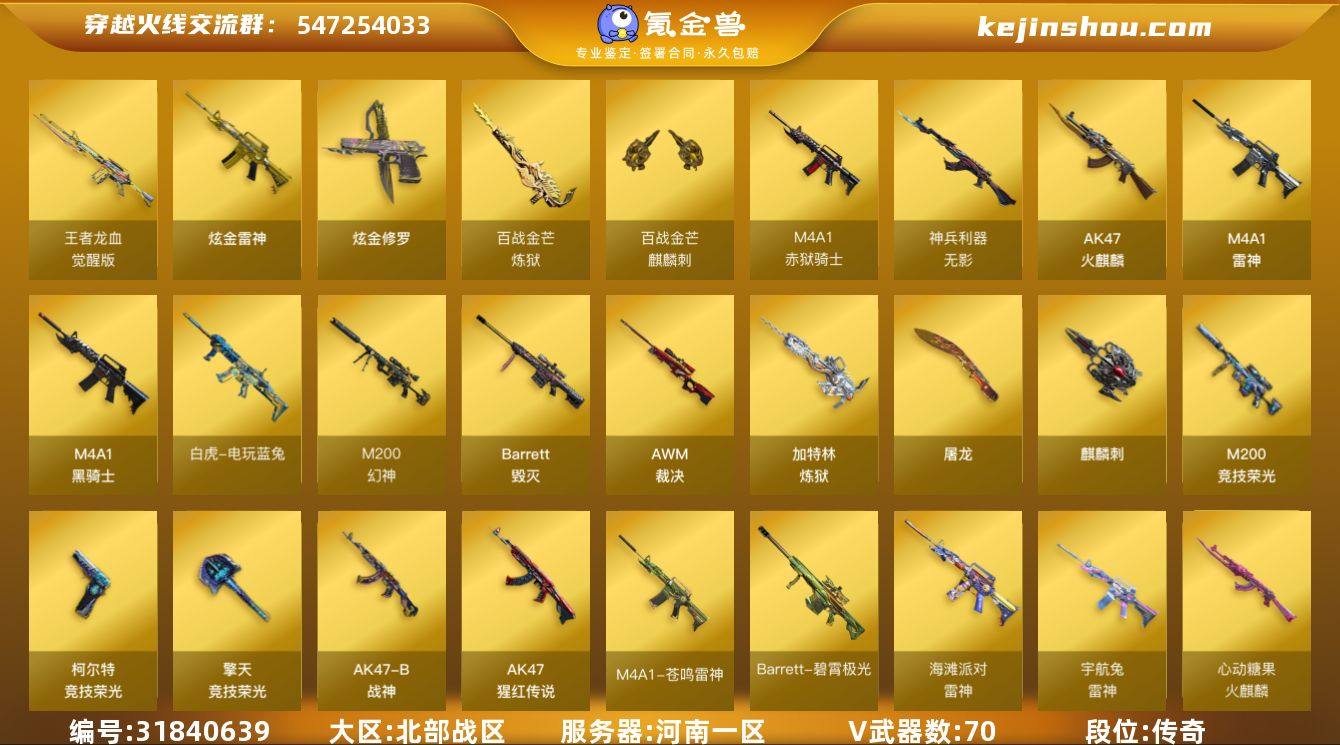 河南一区-72V-6王者武器数-2炫金武器数 【热门武器】:M200-幻神,M200-竞技荣光,死亡之眼,白虎-电玩蓝兔,M4A1-黑骑士,加特林-炼狱,裁决-雪莉杨,USP-雷暴,金刚伞 【王者炫金武器】:炫金雷神,炫金修罗 【音效卡】:M4A1-黑骑士音效卡,Barrett-碧霄极光音效卡,炼狱-百战金芒-庆典舞曲音效卡 【皮肤】:幻神-动感闪耀 皮肤,幻神-电竞之星 皮肤,金色蔷薇-电竞之星 皮肤,AWM-裁决-凤灵皮肤,裁决-运输船 皮肤,裁决-胜者为王 皮肤,雷神-宇航兔皮肤,雷神-海滩派对 皮肤,雷神-源计划2.0专属 皮肤,M4A1-再燃火线,雷神-神秘按键 皮肤,火麒麟-战神关羽,火麒麟-平天大圣,火麒麟-心动糖果,毁灭-暗月,毁灭-航天科技皮肤,毁灭-虹光风暴 皮肤,毁灭-英雄计划 皮肤,黑骑士-破界 皮肤,战神-紫绶金章皮肤,战神-流金岁月皮肤,修罗-百战金芒 皮肤,屠龙-春桃 皮肤,轻型军用手斧-再燃火线,龙啸-青青莓果 皮肤 【角色】:电竞教官-云悠悠,零·纪元,战地猎狐,奇洋探员,葵-阿尔法武装,风暴女,虎妞,嘉年华灵狐,兰-海滩派对,灵狐者-X,灵狐者-黄金海岸,龙儿,萌儿,潘多拉-X,潘多拉-甜心教官,斯沃特-X,蜀雪,雪莉杨 【人偶武器】:裁决-雪莉杨,AWM-灵狐-15周年嘉年华,迷你深渊冰龙,夺魂,迷你牛牛,生化手雷-机甲核心,迷你超能女侍 【暴走生化】:死亡之眼 【挑战大师】:冰龙粉碎者-白马银枪*2,神圣爆裂者-末日III 【英雄级武器】:AK47-火麒麟*2,M4A1-雷神,M4A1-黑骑士,QBZ03-天罚,无影-神兵利器,QBZ03-独角-IV,AK-47-猩红传说*2,AK47-B-战神,王者龙血-觉醒版,白虎-电玩蓝兔,Barrett-毁灭,AWM-裁决,M200-幻神,M200-竞技荣光,加特林-炼狱,炼狱-百战金芒,USP-雷暴,柯尔特-竞技荣光,柯尔特-电竞之星,屠龙,马来剑-夜魔,麒麟刺*2,擎天-竞技荣光*2,麒麟刺-百战金芒,高...