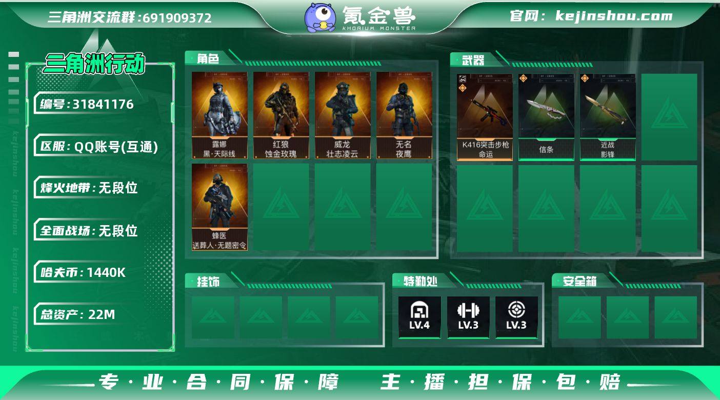 LJ4097总资产22.4M哈弗币1440K近战武器-影锋,近战武器-信条红狼蚀金玫瑰,威龙壮志凌云,无名夜鹰,蜂医送葬人无题密令,露娜黑天际线K416突击步枪-命运(优品B)信条捆绑包AW子弹23发三角币64仓库LV.7高级安全箱靶场LV.5训练中心LV.6统统拿走,红狼-蚀金玫瑰,威龙-壮志凌云,无名-夜鹰,蜂医-送葬人·无题密令,露娜-黑·天际线,近战-影锋,近战-信条,K416突击步枪-命运,挂饰-统统拿走