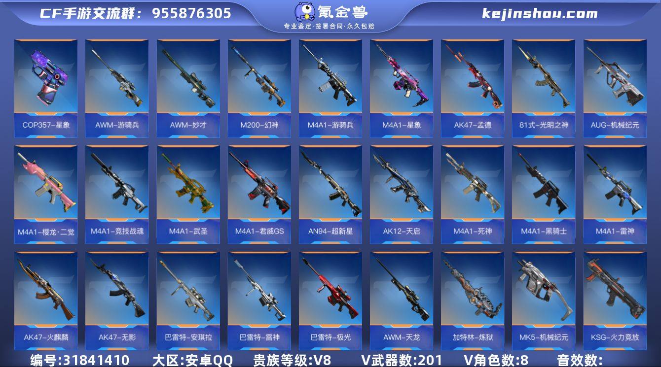 FC-24DEE3 安卓QQ,成人号:是,角色等级:162,实名:有修改人脸机会/实名是本人,段位:大师S,VIP等级:V8,V武器数量:201,V角色数量:8,V总数量:239,王者武器数:18,万化数量:268, 【人物角色】蝴蝶,关小雨,子涵,大老师,堕天使,审判者,曼陀罗,幻影,潘多拉,奥摩,斯沃特,祝融夫人,云悠悠-心动起点, 【王者武器】王者之誉,王者之势闪光弹,王者之势手雷,王者之翼手雷,王者之翼闪光弹,王者之影闪光弹,王者之影烟雾弹,王者之势烟雾弹,王者之翼烟雾弹,王者之心,王者之影,王者之翼,王者之怒,王者之轮,王者之锋,王者之击,王者之烈,王者之狱, 【至尊套装】翼至尊,烈至尊, 【带V枪械】王者之锋-HeartShot,王者之势手雷-冰霜奇迹,MK5-机械纪元-蚀刻战甲,AK47-无影-汗血之征,AK47-孟德-过载,M4A1-樱龙·二觉,M4A1-星象,M4A1-竞技战魂,M4A1-武圣,M4A1-君威GS,M4A1-游骑兵,M4A1-死神,M4A1-黑骑士,M4A1-雷神,AK47-孟德,M4A1-雷神-暗月,AK47-冰魂觉醒,M4A1-竞技战魂-情久,AK47-火麒麟,AK47-无影,81式-光明之神,AN94-超新星,AUG-机械纪元,AK12-天启,M200-幻神,巴雷特-安琪拉,巴雷特-雷神,巴雷特-极光,AWM-妙才,AWM-游骑兵,AWM-天龙,加特林-炼狱,巴雷特-毁灭-寒霜,MK5-机械纪元,KSG-火力竞放,贝雷塔-力拔山河,蟒蛇-妙才,双管猎枪-黑骑士,COP 357-星象,QSZ92-天使,GLOCK18-武圣,81式-光明之神-千变,