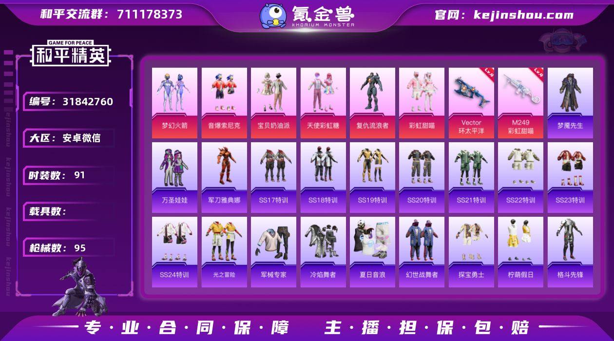 【AZH1698】安卓 微信【梦幻火箭 彩虹甜喵 俏皮奶喵】6粉装-2特效枪-0载具-0粉色飞行器-35814热力值-6王牌印记-91套装-95枪皮 【热门品类】:粉装-梦幻火箭,粉装-音爆索尼克,角色-军刀雅典娜 【粉色套装】:粉装-宝贝奶油派,粉装-天使彩虹糖,粉装-梦幻火箭,角色-复仇流浪者,粉装-彩虹甜喵,粉装-音爆索尼克 【粉色枪皮等级】:Vector-环太平洋(四级),M249-彩虹甜喵(四级) 【粉色枪皮】:Vector-环太平洋,M249-彩虹甜喵 【粉色降落伞】:甜心宝贝降落伞,梦幻火箭降落伞,洛神天依降落伞,碧影闪光降落伞,炙焰牛王降落伞,环太平洋降落伞,垂柳戏鸭降落伞,彩虹甜喵降落伞,千面幻镜降落伞,旋转彩虹降落伞,海螺星光降落伞 【稀有枪皮】:AKM-彩虹符号,AKM-灼热熔岩,AKM-环太平洋,AKM-虎虎生威,AKM-霓虹街区,M16A4-幻世战舞者,M16A4-甜心亚梦,SCAR-L-玉兔迎春,SCAR-L-红色方程式,SCAR-L-银碳小老虎,M416-暗夜行者,M416-暗星紫秘,M416-糯团青竹,M416-红色方程式,GROZA-异彩先驱,GROZA-田园牧歌,AUG-耀粉歌者,QBZ-洛神天依,QBZ-飞驰魅影,M762-天降萌叽,M762-彩虹甜喵,M762-彩虹符号,M762-瑞龙福将,M762-甜心宝贝,Mk47-妙红点点,Mk47-洛神天依,AC-VAL-天降萌叽,AC-VAL-彩虹甜喵,AC-VAL-甜心亚梦,蜜獾-垂柳戏鸭,蜜獾-天降萌叽,蜜獾-娇憨猪猪,UZI-墨染幽兰,UZI-娇憨猪猪,UMP45-仲夏莫吉托,UMP45-海渊国主,Vector-田园牧歌,Vector-音爆索尼克,汤姆逊-异彩先驱,汤姆逊-炫彩节奏,汤姆逊-环太平洋,MP5K-异彩先驱,P90-飞驰魅影,Kar98K-影袭,Kar98K-梦幻火箭,Kar98K-洛神天依,Kar98K-蓝莓炮弹,Kar98K-飞驰魅影,AWM-垂柳戏鸭,VSS-田园牧歌,Mini14-异彩先驱,Mini14-旋转彩虹,Mini14-梦幻火箭,Mini14-筑梦精灵,Win94-瑞龙福将,SLR-娇憨猪猪,AMR-妙红点点,S18...