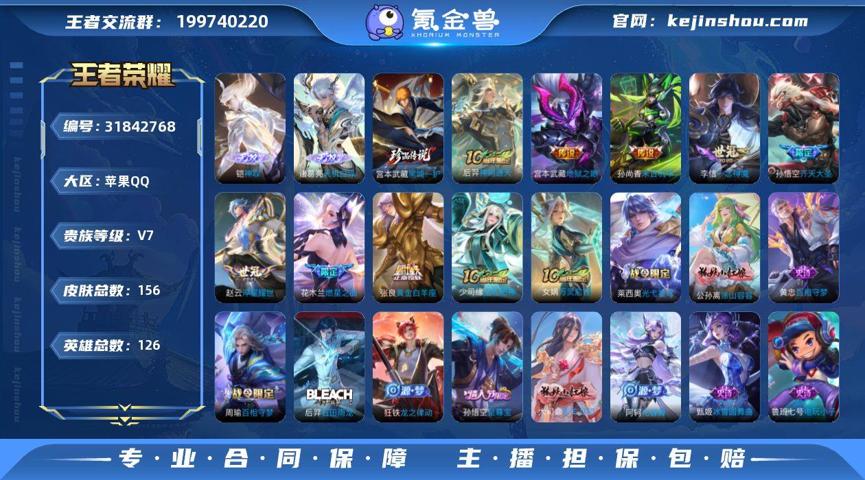 实名: 可修改 贵族等级: V7 英雄数: 126 皮肤数: 156 无双皮: 天机白泽,神罪 珍品传说: 黑崎一护 传说皮: 黄金白羊座,一念神魔,末日机甲-孙尚香,地狱之眼,淬星耀世,燃星之曲,神树通天 限定皮: 梁祝,至尊宝,高山流水,寅虎·展翼,五谷丰年,齐天大圣