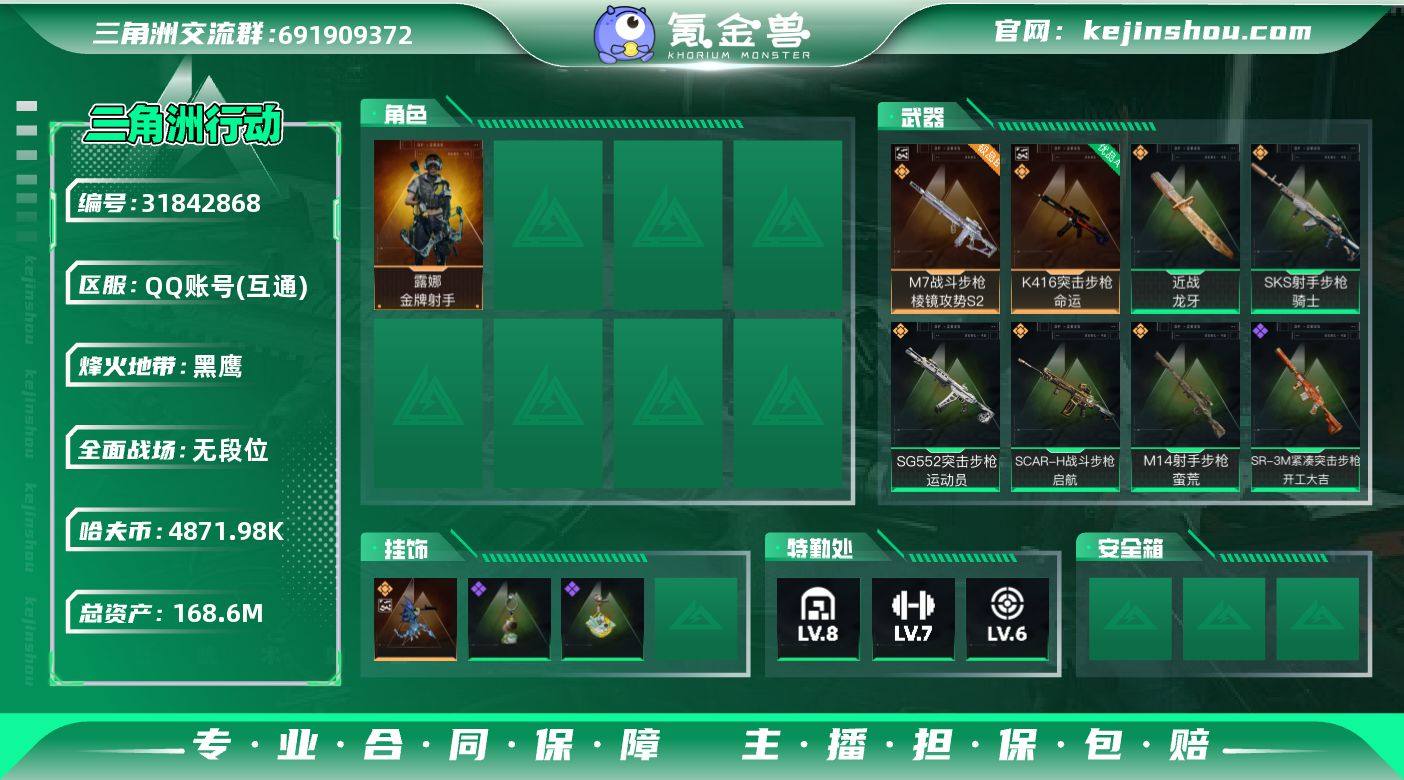 实名:不可二次实名 总资产:168.6M 哈夫币:4871.98K 烽火地带段位:黑鹰 烽火地带等级:60 全面战场段位:无段位 全面战场等级:10 8级仓库,7级训练中心,6级靶场,5级指挥中心,2级潜水中心,3级防具台,3级工作台,3级制药台,3级技术中心,1级收藏室 战术部门等级:3 战斗部门等级:2 医疗部门等级:3 研发部门等级:2 后勤部门等级:2 曼德尔砖-气象感应:0 曼德尔砖-命运王牌:0 曼德尔砖-电玩高手:0 曼德尔砖-美杜莎:0