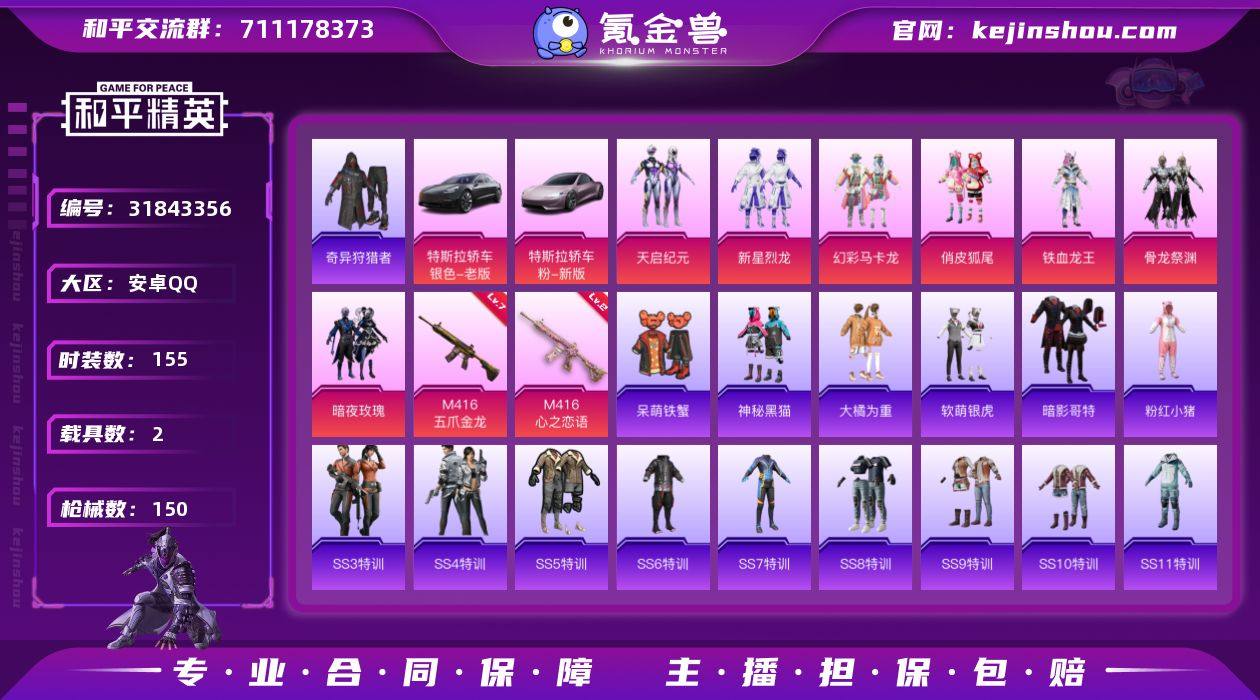 安卓 手Q-7粉装-2特效枪-2载具-56659热力值-2印记-155套装-150枪皮 【热门品类】:套装-奇异狩猎者,旭日初心兜帽大衣,套装-暗影哥特,套装-粉红小猪 【粉色套装】:粉装-天启纪元,粉装-新星烈龙,粉装-幻彩马卡龙,粉装-俏皮狐尾,粉装-铁血龙王,粉装-骨龙祭渊,粉装-暗夜玫瑰 【粉色枪皮等级】:M416-五爪金龙(七级M416-五爪金龙),M416-心之恋语(二级M416-心之恋语) 【粉色载具】:特斯拉Model 3(冷光银),特斯拉Roadster(沁心粉) 【粉色枪皮】:M416-五爪金龙,M416-心之恋语 【粉色降落伞】:百万伏特降落伞,春暖花开降落伞,梦幻火箭降落伞,天启纪元降落伞,PEL轰鸣竞梦者降落伞,神秘黑猫降落伞,古堡领主降落伞,荧光虫舞降落伞,香水柠檬降落伞,极意拳锋降落伞,炫彩糖果降落伞 【稀有套装】:套装-炫彩糖果 【稀有枪皮】:AKM-四圣焕新,AKM-夜灯,AKM-灼热熔岩,AKM-玉龙,AKM-破晓战魂,AKM-萌趣颜团子,AKM-霓虹街区,M16A4-机械英豪,M16A4-红色方程式,M16A4-魔法学院,SCAR-L-炫彩节奏,SCAR-L-生命誓言,SCAR-L-金风玉露,M416-夜灯,M416-神秘黑猫,M416-红色方程式,M416-蓝色火焰,GROZA-春暖花开,GROZA-治愈之星,GROZA-生命誓言,GROZA-黑色刀锋,AUG-PEC最牛战神,AUG-怪笑疯兔,QBZ-原初圣火,QBZ-神秘黑猫,M762-拳皇97,M762-深海曼妙,M762-牛气冲天,M762-镭射皇者,Mk47-百万伏特,G36C-不夜海上花,UZI-众神之王,UZI-古堡领主,UZI-炫彩节奏,UZI-金风玉露,UMP45-天启纪元,UMP45-快乐主宰,UMP45-生命誓言,Vector-彩虹符号,Vector-治愈之星,Vector-生命誓言,Vector-黑色刀锋,汤姆逊-勇闯险境,汤姆逊-天降萌叽,汤姆逊-奇异狩猎者,汤姆逊-幻影战神,汤姆逊-银刃赛罗,野牛-机械英豪,MP5K-众神之王,MP5K-怪笑疯兔,Kar98K-勇闯险境,Kar98K-古堡领主,Kar98K-...
