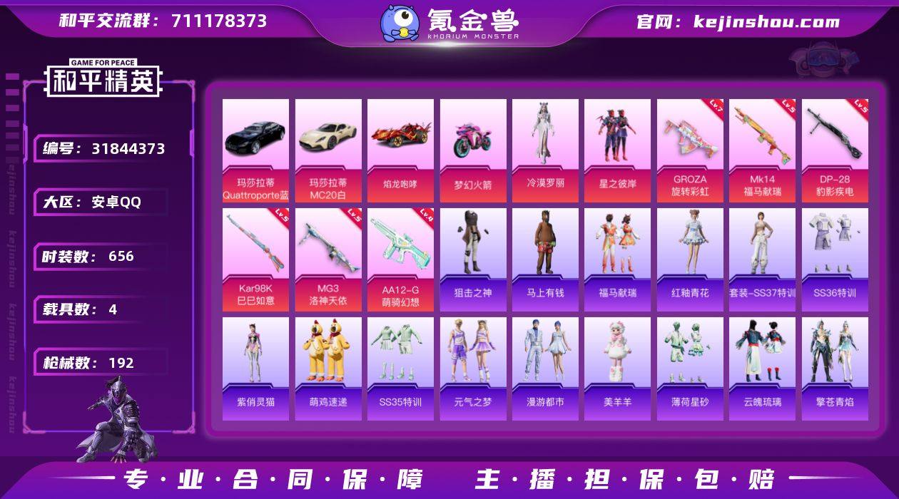实名: 可修改 时装数: 656 载具数: 4 枪械数: 192 战备数: 143 热门装扮: 鹰眼刺客,星之彼岸,冷漠罗丽 载具: 双人摩托-梦幻火箭,焰龙咆哮,玛莎拉蒂MC20(星石白),玛莎拉蒂Quattroporte(夜幕蓝) 稀有枪皮: MG3洛神天依,GROZA旋转彩虹,Kar98K-巳巳如意,DP-28-豹影疾电,AA12-G-萌骑幻想