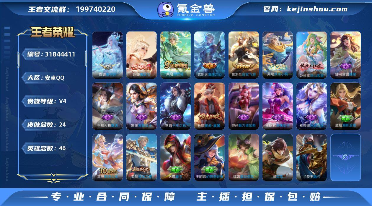 安卓Q-V4-尊贵铂金I段位-46英雄-24皮肤-5传说-9史诗【传说皮肤】:桑启鸣野蒿,貂蝉曦玄引,露娜霜月吟,花木兰冠军飞将,武则天海洋之心【限定皮肤】:孙膑寅虎展翼,鬼谷子天穹祈灯,貂蝉曦玄引【年限皮肤】:孙膑寅虎展翼【赛季限定】:鬼谷子天穹祈灯,亚瑟荣光之誓【战令限定】:周瑜线条小狗【史诗皮肤】:露娜紫霞仙子,王昭君偶像歌手,妲己魅力维加斯,李白千年之狐,雅典娜冰冠公主,娜可露露晚萤,不知火舞魅语,孙膑寅虎展翼,公孙离涂山容容,周瑜线条小狗【其他皮肤】:达摩拳王,王昭君幻想奇妙夜,鬼谷子天穹祈灯,亚瑟荣光之誓,艾琳鹤鸣心笺,虞姬溯影追猎,兰陵王隐刃,嫦娥露花倒影,澜孤猎【营地ID】:1676428864