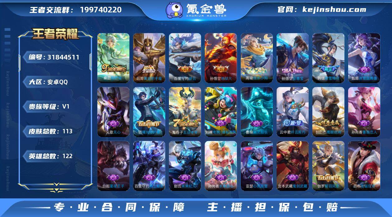 安卓Q-V1-永恒钻石I段位-122英雄-113皮肤-4传说-21史诗【英雄全皮】:空空儿全皮【传说皮肤】:桑启鸣野蒿,百里守约碎云,后羿黄金射手座,孙悟空地狱火【限定皮肤】:姜子牙天穹之誓,狄仁杰阴阳师,赵云皇家上将,孙尚香蔷薇恋人,元歌无心,项羽海滩派对,韩信傲雪梅枪,兰陵王金庭之子,孙悟空至尊宝,李元芳云中旅人,鬼谷子五谷丰年,沈梦溪大漠名商,裴擒虎擒涛扼浪,云中君纤云弄巧,鲁班大师探海日志,桑启海盐诗旅,张良古海寻踪,鬼谷子天穹祈灯,沈梦溪龙舞盛年,刘邦剑破天穹【赛季限定】:兰陵王金庭之子,张良古海寻踪,李元芳云中旅人,沈梦溪大漠名商,裴擒虎擒涛扼浪,鲁班大师探海日志,桑启海盐诗旅,鬼谷子天穹祈灯,刘邦剑破天穹,姜子牙天穹之誓【史诗皮肤】:赵云皇家上将,赵云未来纪元,甄姬冰雪圆舞曲,宫本武藏鬼剑武藏,孙尚香蔷薇恋人,孙尚香水果甜心,妲己魅力维加斯,吕布圣诞狂欢,曹操幽灵船长,孙悟空至尊宝,亚瑟心灵战警,百里守约特工魅影,铠曙光守护者,白起星夜王子,伽罗箭羽风息,狄仁杰鹰眼统帅,云中君纤云弄巧,韩信傲雪梅枪,鬼谷子五谷丰年,元歌无心,刘禅电玩爆裂旋风,周瑜线条小狗【其他皮肤】:项羽海滩派对,韩信教廷特使,韩信街头霸王,露娜哥特玫瑰,达摩大发明家,赵云白执事,赵云忍炎影,程咬金星际陆战队,牛魔西部大镖客,武则天东方不败,宫本武藏未来纪元,安琪拉玩偶对对碰,孙膑天使之翼,妲己少女阿狸,典韦黄金武士,亚瑟死亡骑士,花木兰兔女郎,甄姬花好人间,刘备万事如意,后羿阿尔法小队,狄仁杰阴阳师,刘备纽约教父,刘备汉昭烈帝,关羽龙腾万里,钟无艳海滩丽影,王昭君幻想奇妙夜,狂铁命运角斗场,老夫子功夫老勺,诸葛亮掌控之力,明世隐虹云星官,小乔丁香结,吕布野性能量,刘禅秘密基地,鲁班大师乓乓大师,程咬金无双福将...