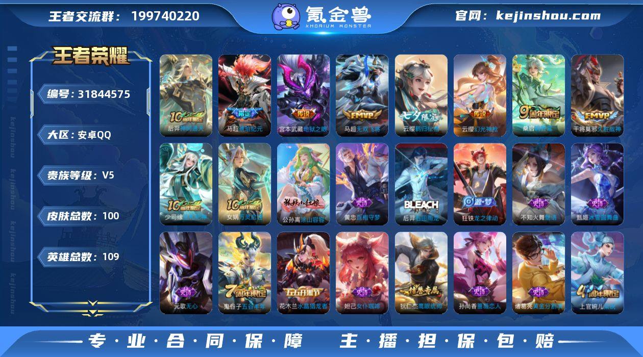 安卓Q-V5-尊贵铂金I段位-109英雄-100皮肤-8传说-31史诗【传说皮肤】:后羿神树通天,云缨幻光神枪,桑启鸣野蒿,马超琥珀纪元,云缨鹤归松栖,马超无双飞将,干将莫邪久胜战神,宫本武藏地狱之眼【限定皮肤】:姜子牙天穹之誓,狄仁杰阴阳师,赵云皇家上将,孙尚香蔷薇恋人,元歌无心,项羽海滩派对,李元芳云中旅人,鬼谷子五谷丰年,沈梦溪大漠名商,裴擒虎擒涛扼浪,上官婉儿梁祝,鲁班大师探海日志,桑启海盐诗旅,云缨鹤归松栖,阿古朵江河有灵,张良古海寻踪,鬼谷子天穹祈灯,马超琥珀纪元,周瑜熔金海岸【赛季限定】:沈梦溪大漠名商,李元芳云中旅人,桑启海盐诗旅,裴擒虎擒涛扼浪,鲁班大师探海日志,张良古海寻踪,鬼谷子天穹祈灯,姜子牙天穹之誓,太乙真人谧流熔炉,钟馗虚灵犬护,甄姬逆浪荇歌,亚瑟荣光之誓【史诗皮肤】:赵云皇家上将,赵云未来纪元,甄姬冰雪圆舞曲,王昭君偶像歌手,宫本武藏鬼剑武藏,孙尚香蔷薇恋人,孙尚香水果甜心,妲己女仆咖啡,墨子金属风暴,吕布圣诞狂欢,张飞乱世虎臣,花木兰水晶猎龙者,兰陵王暗隐猎兽者,诸葛亮黄金分割率,百里守约特工魅影,孙策猫狗日记,伽罗箭羽风息,狄仁杰鹰眼统帅,上官婉儿梁祝,不知火舞魅语,鬼谷子五谷丰年,元歌无心,阿古朵江河有灵,弈星万物之道,狂铁龙之律动,后羿石田雨龙,黄忠百相守梦,公孙离涂山容容,女娲万灵启世,少司缘巫礼祀神,太乙真人瓦猫非猫【其他皮肤】:项羽海滩派对,韩信街头霸王,阿轲爱心护理,赵云白执事,安琪拉玩偶对对碰,姜子牙时尚教父,典韦黄金武士,亚瑟死亡骑士,达摩拳王,狄仁杰阴阳师,刘备纽约教父,钟无艳海滩丽影,王昭君幻想奇妙夜,狂铁命运角斗场,孙尚香沉稳之力,诸葛亮掌控之力,李白敏锐之力,大乔守护之力,刘禅秘密基地,鲁班大师乓乓大师,程咬金无双福将,沈梦溪大漠名商,...