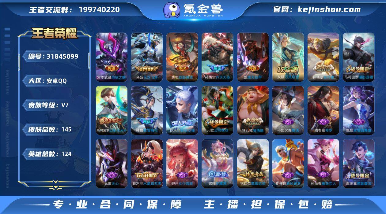 可改实名,安卓Q,2省标,7市标,10县标,16印记,孙悟空幽冥火【荣耀典藏】:孙尚香杀手不太冷【内测皮肤】:孙尚香蔷薇恋人,狂铁特工战影,干将莫邪胡桃夹子【传说皮肤】:孙悟空地狱火,孙尚香末日机甲,李白凤求凰,干将莫邪久胜战神,伽罗太华,李信山海炽霜斩,干将莫邪画中仙,桑启鸣野蒿,云缨幻光神枪【限定皮肤】:姜子牙天穹之誓,狄仁杰阴阳师,赵云皇家上将,嬴政白昼王子,孙尚香蔷薇恋人,鲁班七号狮舞东方,高渐离死亡摇滚,芈月重明,吕布猎兽之王,夏侯惇朔风刀,曹操烛龙,典韦穷奇,典韦蓝屏警告,狄仁杰魔术师,狄仁杰万华元夜,达摩沙漠行僧,项羽海滩派对,老夫子醍醐杖,程咬金演武夺筹,兰陵王金庭之子,孙悟空至尊宝,孙悟空大圣娶亲,牛魔御旌,李元芳银河之约,李元芳云中旅人,钟馗神迹守卫,钟馗驱傩正仪,杨玉环遇见飞天,女娲朔望之晖,干将莫邪胡桃夹子,干将莫邪画中仙,太乙真人饕餮,鬼谷子原初探秘者,鬼谷子五谷丰年,铠青龙志,苏烈千军破阵,百里玄策原初追逐者,百里守约朱雀志,弈星混沌棋,沈梦溪星空之诺,沈梦溪大漠名商,明世隐疑决卦,裴擒虎李小龙,裴擒虎擒涛扼浪,狂铁御狮,米莱狄御霄,李信山海炽霜斩,伽罗太华,上官婉儿梁祝,嫦娥暖冬兔眠,鲁班大师探海日志,桑启海盐诗旅,暃星界游侠,张良古海寻踪,鬼谷子天穹祈灯,刘邦剑破天穹,周瑜熔金海岸【年限皮肤】:百里守约朱雀志,铠青龙志,李白凤求凰,伽罗太华,李信山海炽霜斩【赛季限定】:芈月重明,夏侯惇朔风刀,曹操烛龙,典韦穷奇,狄仁杰万华元夜,达摩沙漠行僧,老夫子醍醐杖,程咬金演武夺筹,兰陵王金庭之子,张良古海寻踪,牛魔御旌,李元芳云中旅人,钟馗驱傩正仪,太乙真人饕餮,鬼谷子原初探秘者,苏烈千军破阵,百里玄策原初追逐者,弈星混沌棋,沈梦溪大漠名商,明世隐疑决卦,裴擒...