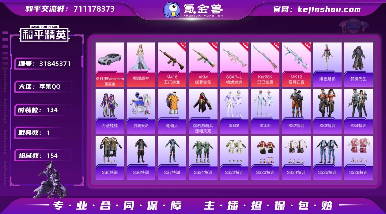 苹果 手Q-1粉装-5特效枪-1载具-0粉色飞行器-44165热力值-10王牌印记-134套装-154枪皮【热门品类】:套装-浪漫天命,套装-SS1特训,套装-龟仙人,熔岩游骑兵连帽夹克【粉色套装】:角色-智耀战神【粉色枪皮等级】:AKM-绿萝繁花(五级),SCAR-L-锦绣绵绵(五级),M416-五爪金龙(七级),Kar98K-巳巳如意(四级),MK12-雪月幻音(四级)【粉色载具】:保时捷Panamera(星辰紫)【粉色枪皮】:AKM-绿萝繁花,SCAR-L-锦绣绵绵,M416-五爪金龙,Kar98K-巳巳如意,MK12-雪月幻音【粉色降落伞】:百万伏特降落伞,至尊龙雀降落伞,未来歌姬降落伞,圣堂之誓降落伞,蜜语绒猫降落伞,星穹咏叹调降落伞,异瞳寒姬降落伞【稀有套装】:套装-龟仙人,套装-紫幽梦,套装-蓝冰羽,角色-绯色魅影【稀有枪皮】:AKM-冰凉西瓜,AKM-霓虹街区,AKM-龙的传人,M16A4-生命誓言,M16A4-红色方程式,SCAR-L-炫彩节奏,SCAR-L-玉兔迎春,SCAR-L-红色方程式,SCAR-L-黄金龙骨,M416-仓鼠灰灰,M416-糯团青竹,M416-红色方程式,M416-蓝色火焰,GROZA-懵萌河马,GROZA-生命誓言,GROZA-田园牧歌,GROZA-黑色刀锋,AUG-耀粉歌者,QBZ-彩虹符号,QBZ-诡娃娃,M762-天降萌叽,M762-诡娃娃,Mk47-妙红点点,G36C-...