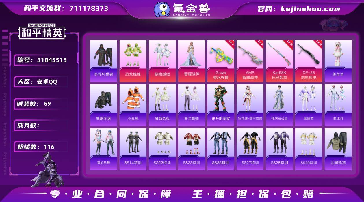 安卓 手Q-3粉装-4特效枪-0载具-1粉色飞行器-34690热力值-2王牌印记-69套装-116枪皮【热门品类】:套装-小丑鱼,套装-奇异狩猎者【粉色套装】:粉装-恐龙拽拽,粉装-萌物绒绒,角色-智耀战神【粉色枪皮等级】:GROZA-香水柠檬(七级),Kar98K-巳巳如意(五级),AMR-智耀战神(六级),DP-28-豹影疾电(三级)【粉色枪皮】:GROZA-香水柠檬,Kar98K-巳巳如意,AMR-智耀战神,DP-28-豹影疾电【粉色飞行器】:星夜魔法师飞行翼【粉色降落伞】:幻影战神降落伞,百万伏特降落伞,春暖花开降落伞,闲梦青缨降落伞,圣堂之誓降落伞,精灵梦叶罗丽降落伞,创世·救赎降落伞,未来领航者降落伞,智耀战神降落伞,时光之吻降落伞【稀有套装】:套装-雏菊兔兔,套装-萝兰蝴蝶,角色-米开朗基罗,角色-狂花道·娜可露露,角色-怀庆长公主,套装-紫幽梦,套装-蓝冰羽,套装-霓虹热舞,玩偶服-美羊羊【稀有枪皮】:AKM-小鹦鹉BEBE,AKM-缤纷海域,M16A4-莲影清波,M16A4-最终圣卫者,M416-暗夜行者,M416-神秘黑猫,GROZA-影袭,GROZA-田园牧歌,AUG-耀粉歌者,M762-天降萌叽,M762-萌物绒绒,Mk47-百万伏特,AC-VAL-快闪甜心,蜜獾-天降萌叽,UZI-墨染幽兰,UZI-天降萌叽,UZI-影袭,UZI-生命誓言,UMP45-繁龙极客,UMP45-仲夏莫吉托,Vector-焰鹰斗篷,Vector-彩虹符号,Vector-田园牧歌,汤姆逊-智耀战神,野牛-粉锦千层,P90-快闪甜心,Kar98K-彩虹符号,Kar98K-梦幻火箭,Kar98K-星穹咏叹调,M24-影袭,AWM-焰鹰斗篷,VSS-田园牧歌,Mini14-穿刺龙虾,Mini14-耀粉歌者,Mk14-是爱神辣,AMR-时光之誓,M417-惊鸿侠骨,MK20-H-快闪甜心,M200-惊鸿侠骨,S686-红色方程式,S1897-百万伏特,S12K-智耀战神,DBS-焰鹰斗篷,SPAS-12-田园牧歌,DP-28-焰鹰斗篷,DP-28-未来战士,DP-28-齐天大圣,MG3-惊鸿侠骨,沙漠之鹰-快闪甜心,沙漠之...