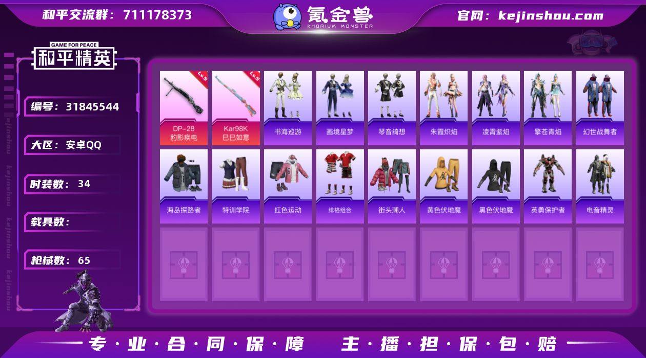 安卓 手Q-2粉装-7特效枪-0载具-0粉色飞行器-42364热力值-8王牌印记-118套装-160枪皮 【热门品类】:套装-深海小丑鱼,套装-龟仙人 【粉色套装】:套装-创世·救赎,角色-冷漠罗丽 【粉色枪皮等级】:GROZA-镜光银凌(五级),蜜獾-异瞳寒姬(四级),Kar98K-巳巳如意(五级),Mk14-甜梦熊击(五级),DP-28-千金淑猫(四级),DP-28-豹影疾电(五级),MG-36-沧焰双生(五级) 【粉色枪皮】:GROZA-镜光银凌,蜜獾-异瞳寒姬,Kar98K-巳巳如意,Mk14-甜梦熊击,DP-28-千金淑猫,DP-28-豹影疾电,MG-36-沧焰双生 【粉色降落伞】:洛神天依降落伞,未来歌姬降落伞,江南烟雨降落伞,忍者神龟降落伞,千金淑猫降落伞,宁雨蝶降落伞,绯穹魔姬降落伞,炫彩糖果降落伞 【稀有套装】:套装-龟仙人,套装-绒宝小鹅,套装-巳巳如意,套装-乐游熊熊,套装-雏菊兔兔,套装-萝兰蝴蝶,角色-达芬奇,套装-糖糖葫芦,套装-青团波波,套装-棉花软糖,角色-光矢逐梦,套装-燕燕于飞,套装-鱼渊荷华,套装-星影赞美诗,套装-霓虹热舞,套装-彩虹兔,套装-云朵鹅,套装-雪绒豹,角色-夜瞳黯灵,套装-朱霞炽焰,套装-凌霄紫焰,套装-擎苍青焰 【稀有枪皮】:AKM-彩虹符号,AKM-破晓战魂,AKM-龙的传人,M16A4-幻世战舞者,M16A4-红色方程式,SCAR-L-夜灯,SCAR-L-炫彩节奏,SCAR-L-玉兔迎春,SCAR-L-红色方程式,M416-糯团青竹,M416-红色方程式,M416-蓝色火焰,GROZA-彩虹符号,GROZA-懵萌河马,GROZA-生命誓言,GROZA-荧海星豚,AUG-天降萌叽,AUG-耀粉歌者,M762-天降萌叽,M762-彩虹符号,M762-云朵鹅,Mk47-妙红点点,G36C-懵萌河马,G36C-星穹咏叹调,AC-VAL-天降萌叽,蜜獾-天降萌叽,ARX-凌霄紫焰,UZI-啾咪啾咪,UZI-天降萌叽,UZI-红色方程式,UZI-月影灵韵,UMP45-夜灯,UMP45-涂山之恋,UMP45-生命誓言,UMP45-蓝色火焰,UMP45-绒宝小...