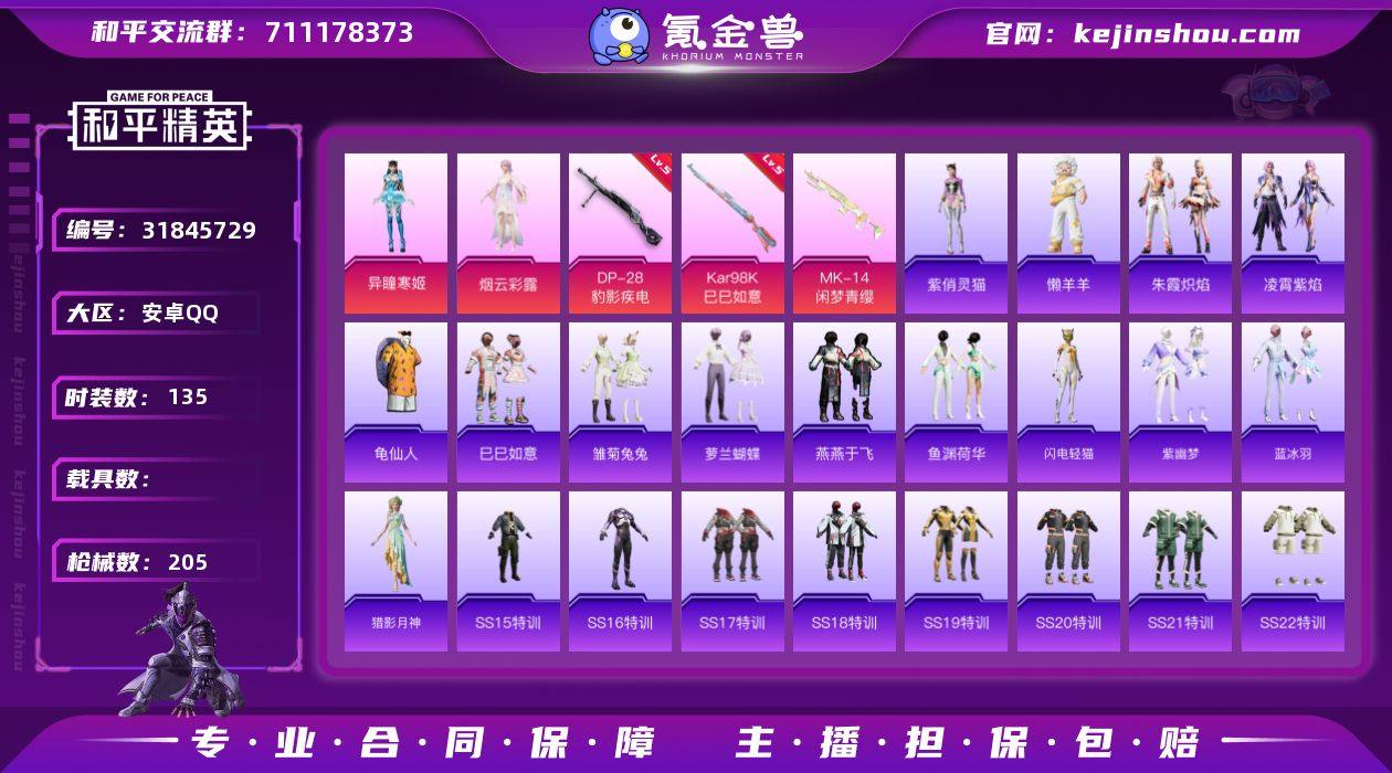 安卓 手Q-2粉装-4特效枪-0载具-1粉色飞行器-53651热力值-17王牌印记-135套装-205枪皮【热门品类】:套装-龟仙人【粉色套装】:角色-烟云彩露,角色-异瞳寒姬【粉色枪皮等级】:Kar98K-巳巳如意(五级),DP-28-豹影疾电(五级)【粉色枪皮】:Kar98K-巳巳如意,Mk14-闲梦青缨,Mk14-福马献瑞,DP-28-豹影疾电【粉色飞行器】:炫彩糖果飞行器【粉色降落伞】:未来歌姬降落伞,精灵梦叶罗丽降落伞,月影灵韵降落伞,幻影飞狐降落伞,星穹咏叹调降落伞,炫彩糖果降落伞【稀有套装】:套装-龟仙人,套装-巳巳如意,套装-雪国风尚,套装-炫彩糖果,套装-雏菊兔兔,套装-萝兰蝴蝶,套装-燕燕于飞,套装-鱼渊荷华,套装-闪电轻猫,套装-紫幽梦,套装-蓝冰羽,角色-猎影月神,套装-朱霞炽焰,套装-凌霄紫焰,玩偶服-懒羊羊,角色-紫俏灵猫【稀有枪皮】:AUG-冰晶雪宝,AKM-彩虹符号,AKM-灼热熔岩,AKM-破晓战魂,AKM-萌趣颜团子,AKM-虎虎生威,AKM-霓虹街区,AKM-龙的传人,M16A4-幻世战舞者,M16A4-红色方程式,M16A4-蓝色火焰,SCAR-L-夜灯,SCAR-L-炫彩节奏,SCAR-L-玉兔迎春,SCAR-L-红色方程式,M416-糯团青竹,M416-红色方程式,M416-蓝色火焰,GROZA-彩虹符号,GROZA-懵萌河马,AUG-天降萌叽,AUG-幻影战神,AUG-耀粉歌者,M762-天降萌叽,M762-暗夜鎏金,M762-烈焰拳霸,G36C-六号树人,G36C-懵萌河马,AC-VAL-天降萌叽,AC-VAL-快闪甜心,蜜獾-天降萌叽,ARX-凌霄紫焰,UZI-啾咪啾咪,UZI-天降萌叽,UZI-炫彩节奏,UZI-红色方程式,UZI-幻影飞狐,UMP45-夜灯,UMP45-生命誓言,UMP45-蓝色火焰,UMP45-绒宝小鹅,Vector-焰鹰斗篷,Vector-生命誓言,汤姆逊-天降萌叽,汤姆逊-炫彩节奏,汤姆逊-耀粉歌者,汤姆逊-智耀战神,MP5K-飒粉甜心,JS9-凌霄紫焰,P90-快闪甜心,P90-巳巳如意,Kar98K-洛神天依,Kar98K-炫彩节...