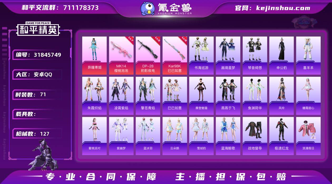 安卓 手Q-1粉装-3特效枪-0载具-2粉色飞行器-31068热力值-3王牌印记-71套装-127枪皮【粉色套装】:角色-异瞳寒姬【粉色枪皮等级】:Kar98K-巳巳如意(五级),Mk14-樱桃泡泡(七级),DP-28-豹影疾电(五级)【粉色枪皮】:Kar98K-巳巳如意,Mk14-樱桃泡泡,DP-28-豹影疾电【粉色飞行器】:绝对恒星飞行器,炫彩糖果飞行器【粉色降落伞】:绝对恒星降落伞,星空武士降落伞,精灵梦叶罗丽降落伞,樱桃泡泡降落伞,炫彩糖果降落伞【稀有套装】:套装-巳巳如意,套装-雪国风尚,套装-炫彩糖果,角色-摩登魅猫,套装-燕燕于飞,套装-鱼渊荷华,角色-风玲,角色-糖霜甜心,角色-蜜桃派对,套装-紫幽梦,套装-蓝冰羽,套装-云朵鹅,套装-雪绒豹,套装-蓝海鲸歌,套装-朱霞炽焰,套装-凌霄紫焰,套装-擎苍青焰,玩偶服-喜羊羊,角色-申公豹,套装-书海巡游,套装-画境星梦,套装-琴音绮想【稀有枪皮】:AKM-破晓战魂,M416-红色方程式,M416-蓝色火焰,GROZA-治愈之星,AUG-天降萌叽,AUG-耀粉歌者,M762-彩虹符号,M762-云朵鹅,ACE32-画境星梦,ARX-凌霄紫焰,UZI-啾咪啾咪,UMP45-极意拳锋,Vector-生命誓言,汤姆逊-樱桃泡泡,MP5K-画境星梦,AKS-74U-荧光像素,JS9-凌霄紫焰,P90-巳巳如意,M24-樱桃泡泡,MK20-H-樱桃泡泡,SVD-云朵鹅,M1加兰德-画境星梦,S686-巳巳如意,S1897-荧海星豚,S12K-玩趣呆呆,S12K-破晓战魂,S12K-极意拳锋,AA12-G-画境星梦,SPAS-12-云朵鹅,M249-彩虹符号,M249-糯团青竹,MG3-幻世战舞者,PKM-荧光像素,MG-36-凌霄紫焰,P92-凌霄紫焰,短管霰弹-竹节火铳,蝎式手枪-六号稻草人,沙漠之鹰-云朵鹅,爆炸猎弓-喜羊羊与灰太狼,大砍刀-云朵鹅,平底锅-凌霄紫焰,平底锅-画境星梦,破片手榴弹-巳巳如意【其他套装】:套装-战地督导,套装-极速红龙,套装-浪漫假日,套装-海岛探路者,套装-王...