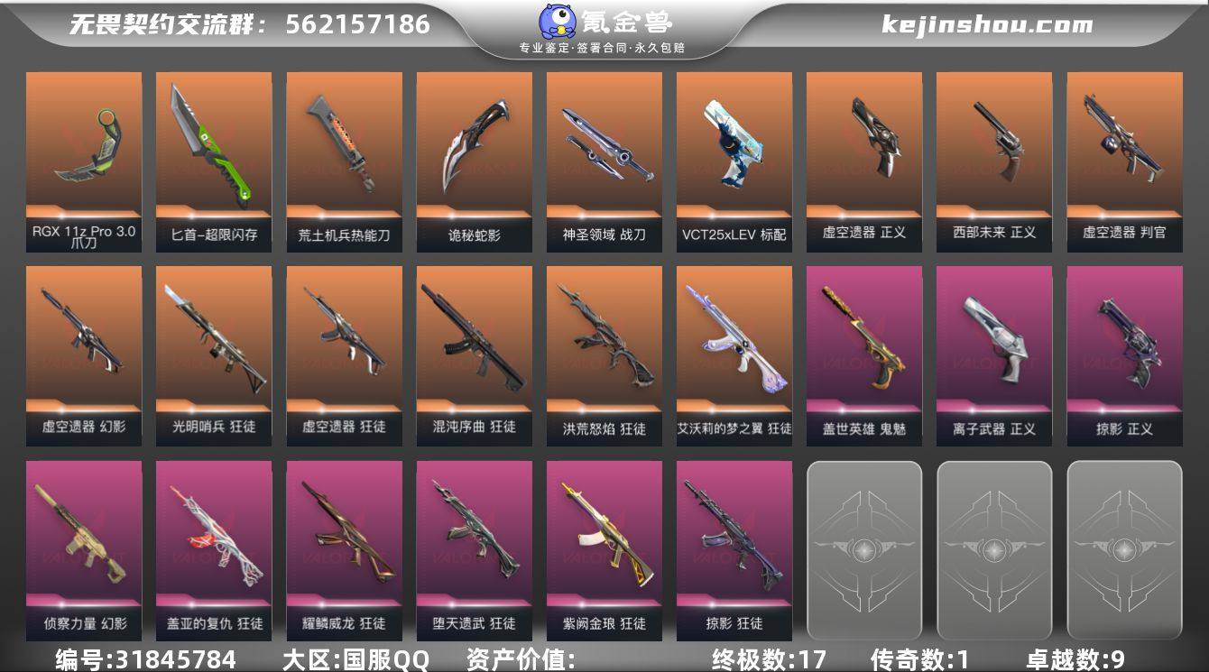 【套装】:虚空遗器套装【英雄】:幻棱,炼狱,维斯,暮蝶,钛狐,壹决,铁臂,捷风,雷兹,幽影,不死鸟,贤者,猎枭,蝰蛇,零,芮娜,奇乐,尚勃勒,霓虹,斯凯,夜露,星礈,K/O,海神,盖可,黑梦,钢锁【近战武器】:近战武器-神之刃,近战武器-RGX 11z Pro//3.0 爪刀,近战武器-黑波之刃,近战武器-源始幻刃,近战武器-超限闪存 匕首,近战武器-荒土机兵 热能刀,近战武器-诡秘蛇影 军刀,近战武器-神圣领域 战刀【狂徒】:狂徒-艾沃莉的梦之翼,狂徒-光明哨兵,狂徒-洪荒怒焰,狂徒-混沌序曲,狂徒-虚空遗器,狂徒-堕天遗武,狂徒-掠影,狂徒-盖亚的复仇,狂徒-耀鳞威龙,狂徒-紫阙金琅,狂徒-荒土机兵,狂徒-诡秘蛇影【幻影】:幻影-虚空遗器,幻影-侦察力量,幻影-超限闪存,幻影-神圣领域,幻影-纳米打击,幻影-末日之翼【戍卫】:戍卫-浮光跃金,戍卫-逆冲蛮牛,戍卫-月球哨兵,戍卫-折光棱晶【獠犬】:獠犬-神圣领域,獠犬-模拟赫兹,獠犬-逆冲蛮牛【冥驹】:冥驹-荒土机兵,冥驹-模拟赫兹,冥驹-星云暗涌【飞将】:飞将-末日之翼【莽侠】:莽侠-超限闪存,莽侠-诡秘蛇影,莽侠-月球哨兵【战神】:战神-神圣领域,战神-浮光跃金【奥丁】:奥丁-纳米打击,奥丁-末日之翼【判官】:判官-虚空遗器,判官-诡秘蛇影,判官-纳米打击x【雄鹿】:雄鹿-模拟赫兹,雄鹿-逆冲蛮牛,雄鹿-月球哨兵【骇灵】:骇灵-荒土机兵,骇灵-浮光跃金,骇灵-星云暗涌【蜂刺】:蜂刺-超限闪存,蜂刺-星云暗涌,蜂刺-折光棱晶【标配】:标配-荒土机兵,标配-浮光跃金,标配-折光棱晶【VCT手枪】:标配-VCT25 x LEV【正义】:正义-西部未来,正义-虚空遗器,正义-掠影,正义-离子武器,正义-超限闪存,正义-纳米打击,正义-月球哨兵【鬼魅】:鬼魅-盖世英雄,鬼魅-诡秘蛇影,鬼魅-模拟赫兹,鬼魅-星云暗涌【狂怒】:狂怒-神圣领...
