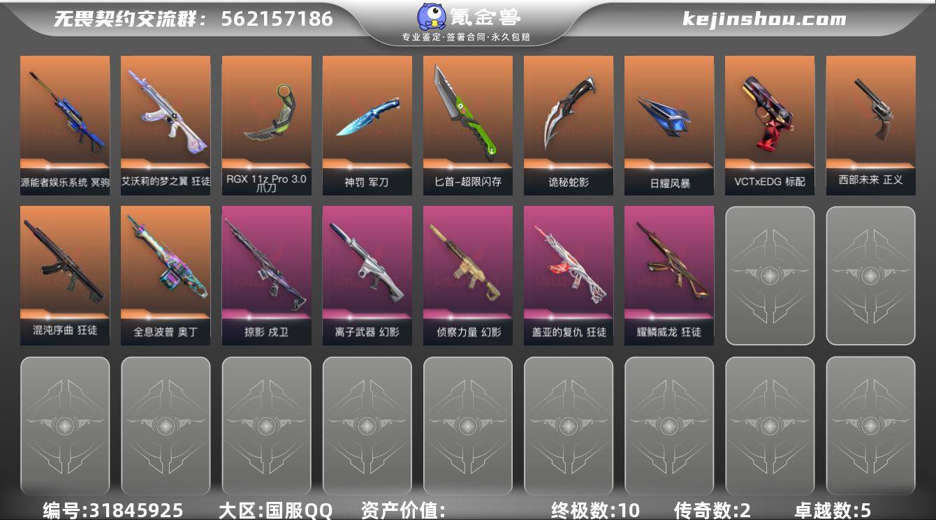 【套装】:VCTxEDG 队伍套装【英雄】:幻棱,炼狱,维斯,暮蝶,钛狐,壹决,铁臂,捷风,幽影,不死鸟,贤者,猎枭,蝰蛇,零,芮娜,尚勃勒,霓虹,斯凯,夜露,K/O,海神,盖可,黑梦【近战武器】:近战武器-紫金爪刀,近战武器-RGX 11z Pro//3.0 爪刀,近战武器-超限闪存 匕首,近战武器-神罚 军刀,近战武器-诡秘蛇影 军刀,近战武器-日耀风暴 遗器【狂徒】:狂徒-艾沃莉的梦之翼,狂徒-混沌序曲,狂徒-盖亚的复仇,狂徒-耀鳞威龙,狂徒-诡秘蛇影【幻影】:幻影-离子武器,幻影-侦察力量,幻影-超限闪存,幻影-神圣领域,幻影-末日之翼【戍卫】:戍卫-掠影,戍卫-浮光跃金,戍卫-月球哨兵,戍卫-折光棱晶【獠犬】:獠犬-神圣领域,獠犬-模拟赫兹【冥驹】:冥驹-源能者娱乐系统,冥驹-模拟赫兹【飞将】:飞将-末日之翼【莽侠】:莽侠-超限闪存,莽侠-诡秘蛇影,莽侠-月球哨兵【战神】:战神-神圣领域,战神-浮光跃金【奥丁】:奥丁-全息波普,奥丁-末日之翼【判官】:判官-诡秘蛇影【雄鹿】:雄鹿-模拟赫兹,雄鹿-月球哨兵【骇灵】:骇灵-浮光跃金,骇灵-星云暗涌【蜂刺】:蜂刺-超限闪存,蜂刺-星云暗涌,蜂刺-折光棱晶【标配】:标配-浮光跃金,标配-折光棱晶【VCT手枪...