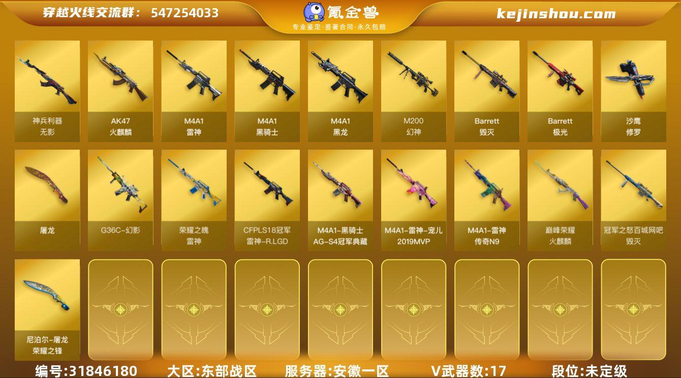 安徽一区-21V-0王者武器数-0炫金武器数 【热门武器】:G36C-幻影,M200-幻神,M4A1-黑骑士,沙鹰-修罗*5,Knife-冠军之刃 【皮肤】:幻神-冠军之幻,幻神-宠儿-2021MVP,M200-幻神-荣耀世冠白鲨,M200-幻神-N9-2022MVP,幻神-电流骇客 皮肤,雷神-荣耀之魄,雷神-传奇N9,雷神-宠儿-2019MVP,雷神-R.LGD-CFPLS18冠军,火麒麟-巅峰荣耀,毁灭-冠军之怒,黑骑士-AG-S4冠军典藏,屠龙-荣耀之锋 【角色】:暗夜-X,电竞少女,风暴女,嘉年华灵狐,兰-海滩派对,0号玩家,灵狐者-X,潘多拉-X,蛇姬,斯沃特-X,影武者-X 【人偶武器】:AWM-灵狐-15周年嘉年华,迷你牛牛 【挑战大师】:神圣爆裂者-末日III 【英雄级武器】:AK47-火麒麟,M4A1-黑龙*2,M4A1-雷神,M4A1-黑骑士,无影-神兵利器,G36C-幻影,Barrett-毁灭,Barrett-极光,M200-幻神,沙鹰-修罗*5,屠龙 【道具】:BS战队炫彩背包,CFS限定背包,炫彩背包,救世主-黑桃战神,黄金生化钩,绿色巨人,灵魂忍者,迷雾幽灵,夺命之镰*2,防化服*2,金色流光-枪王排位*2,星辰流光-枪王排位,巅峰赛先锋-金色流光,枪王排位28赛季金色流光,枪王排位29赛季金色流光,EP战队名片,EP战队喷图,防弹头盔*3,防弹衣*3,C4工具钳*3,手雷包*3 【特殊枪械】:1黑骑士