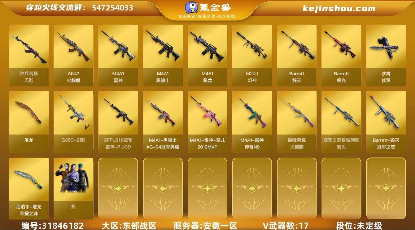 安徽一区-21V-0王者武器数-0炫金武器数 【热门武器】:G36C-幻影,M200-幻神,M4A1-黑骑士,沙鹰-修罗*5,Knife-冠军之刃 【皮肤】:幻神-冠军之幻,幻神-宠儿-2021MVP,M200-幻神-荣耀世冠白鲨,M200-幻神-N9-2022MVP,幻神-电流骇客 皮肤,雷神-荣耀之魄,雷神-传奇N9,雷神-宠儿-2019MVP,雷神-R.LGD-CFPLS18冠军,火麒麟-巅峰荣耀,毁灭-冠军之怒,黑骑士-AG-S4冠军典藏,屠龙-荣耀之锋 【角色】:暗夜-X,电竞少女,风暴女,嘉年华灵狐,兰-海滩派对,0号玩家,灵狐者-X,潘多拉-X,蛇姬,斯沃特-X,影武者-X 【人偶武器】:AWM-灵狐-15周年嘉年华,迷你牛牛 【挑战大师】:神圣爆裂者-末日III 【英雄级武器】:AK47-火麒麟,M4A1-黑龙*2,M4A1-雷神,M4A1-黑骑士,无影-神兵利器,G36C-幻影,Barrett-毁灭,Barrett-极光,M200-幻神,沙鹰-修罗*5,屠龙 【道具】:BS战队炫彩背包,CFS限定背包,炫彩背包,救世主-黑桃战神,黄金生化钩,绿色巨人,灵魂忍者,迷雾幽灵,夺命之镰*2,防化服*2,金色流光-枪王排位*2,星辰流光-枪王排位,巅峰赛先锋-金色流光,枪王排位28赛季金色流光,枪王排位29赛季金色流光,EP战队名片,EP战队喷图,防弹头盔*3,防弹衣*3,C4工具钳*3,手雷包*3 【特殊枪械】:1黑骑士