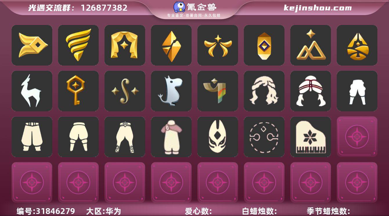13季12翼白枭透明蝶翼巫师帽欧若拉之翼绊爱彩虹武士裤蛛网斗篷莲花斗篷 资源:蜡烛593 爱心210 红烛65 12翼 已毕业地图:全图毕业 毕业季节:风行季 潜海季 表演季 破晓季 欧若拉季 追忆季 夜行季 九色鹿季 归巢季 姆明季 彩染季 青鸟季 拾光季季卡 毕业季节物品: 多羽发饰 蓝黄羽袖 暗红斗篷 单边小辫 氧气面具 燕尾斗篷 黄眉企鹅面具 白枭发型 双翼遥鲲斗篷 冥龙斗篷 留辨蘑菇头 高领舞服 透明蝶翼斗 肩带 追忆之书 九色鹿丸子头 九色鹿丝带裤 九色鹿飞天斗篷 棕熊面具 绒毛斗篷 五塑彩羽发 五塑彩带斗 姆明抱枕 姆明大伞 姆明长裙 彩染围巾斗篷 辉光羚羊面具 青鸟面饰 青鸟斗篷 稀有礼包:祥云瑞气服饰 暗彩装扮 巫师帽 绊爱套装 青衫落拓礼包 大桔大利 小狗周年头饰 星月头冠 九色鹿角 圣诞鹿角 欧若拉之翼 蛛网斗篷 祥云雨伞 皮皮猫 周年抱枕 大铁头 莲花斗篷 新春福娃礼包 热门裤子:遥鲲长袍 绑带舞服 奔月长袍 妮妮长裙 海洋武士裤 白棉裤 搓澡巾 紧身连体衣 武士裤 羽袖长袍 小丑服 女仆围裙 红色流珠裙 探险燕尾服 祥云瑞气服饰 暗彩装扮 热门面具: 矮人面具 狐狸面具 黄鼠狼面具 潜海面具 黄眉面具 一字眉 棕熊面具 盲僧眼罩 向导面具 红脸蛋面具 玫瑰花面具 粽叶面具 黑脸 鸟羽面具 热门发型:海藻头 爆炸头 大胡子 小飞象 雨妈 卡卡 平菇 龙骨 指甲盖 箬笠 公主头 水母头 书虫 总裁头 正太 高马尾 明制帽 郡主头 斗笠 绿丝带 虚荣 白枭 圆环发辫 留辫蘑菇头 彩色脏辫 彩羽发型 兔子头 春丽丸子头 樱花头 巫师帽 猫猫头 圣诞帽 绊爱发型 光头 青衫落拓发型 热门头饰:多羽发饰 尖...