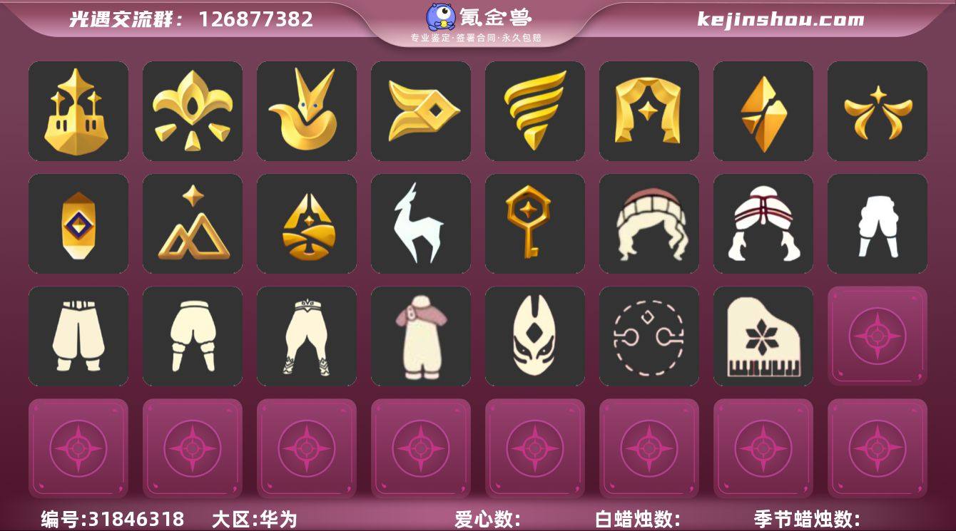 12季11翼白枭绊爱武士裤TGC斗篷欧若拉之翼透明蝶翼九色鹿角圣诞鹿角 资源:蜡烛122 爱心94 红烛42 翼11 已毕业地图:全图毕业 毕业季节:潜海季 表演季 欧若拉季 追忆季 夜行季 拾光季 归巢季 九色鹿季 筑巢季 二重奏季 姆明季 彩染季 毕业季节物品:暗红斗篷 单边小辫 氧气面具 燕尾斗篷 黄眉企鹅面具 白枭发型 留辨蘑菇头 高领舞服 透明蝶翼斗 肩带 追忆之书 棕熊面具 绒毛斗篷 粗框眼镜 季卡相机 西部帽 五塑彩羽发 五塑彩带斗 九色鹿丸子头 九色鹿丝带裤 九色鹿飞天斗篷 设计师长袍 光之子试衣 合奏挂画 蓝色燕尾服 白色高脚钢琴 姆明抱枕 姆明大伞 姆明长裙 彩染围巾斗篷 辉光羚羊面具 稀有礼包:绊爱套装 大桔大利 雪花发饰 星月头冠 九色鹿角 圣诞鹿角 TGC斗篷 欧若拉之翼 年年有鱼礼包 荷叶伞 冥龙南瓜 水晶灯 热门裤子:背带裤 绑带舞服 奔月长袍 妮妮长裙 海洋武士裤 白棉裤 紧身连体衣 武士裤 小丑服 女仆围裙 美工衣 米色西装裤 热门面具:矮人面具 狐狸面具 还是铝镁合金 潜海面具 黄眉面具 一字眉 棕熊面具 盲僧眼罩 向导面具 红脸蛋面具 龙头 玫瑰花面具 玫瑰面具 黑脸 粽叶面具 热门发型:海藻头 爆炸头 大胡子 小飞象 雨妈 卡卡 平菇 龙骨 指甲盖 箬笠 蝴蝶结 公主头 粗辫 水母头 书虫 总裁头 正太 高马尾 明制帽 价值认同 逗留 绿丝带 虚荣 白枭 圆环发辫 留辫蘑菇头 彩色脏辫 彩羽发型 双辫发型 春丽丸子头 锦鲤头 樱花头 马蹄莲发型 遥鲲发型 猫猫头 女巫发型 圣诞帽 绊爱发型 光头 热门头饰:尖角牛仔帽 牛仔帽 大桔大利 花环 珊瑚发饰 雪花发饰 蓝色音乐会 晃悠悠 四叶草 红...