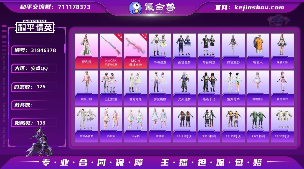 YXc26163-【无二次协助处理】【因赛季更新游戏段付以上号为准!】 安卓Q-1粉装6特效枪3热门126套装136枪皮 42154热力值 11印记 历史传奇王牌10星 【2粉装】 萨利娅 霁蓝缠春 【5特效枪】 Kar98K-巳巳如意 (5级) Mk14-樱桃泡泡 (3级) AKS-74U-森灵之息 (5级) Mk14-福马献瑞 (5级) ACE32-萌骑漫游 (3级) 【3热门】 龟仙人 破蛋小黄鸡 极速红龙 【1头盔】 精灵迷巫头盔