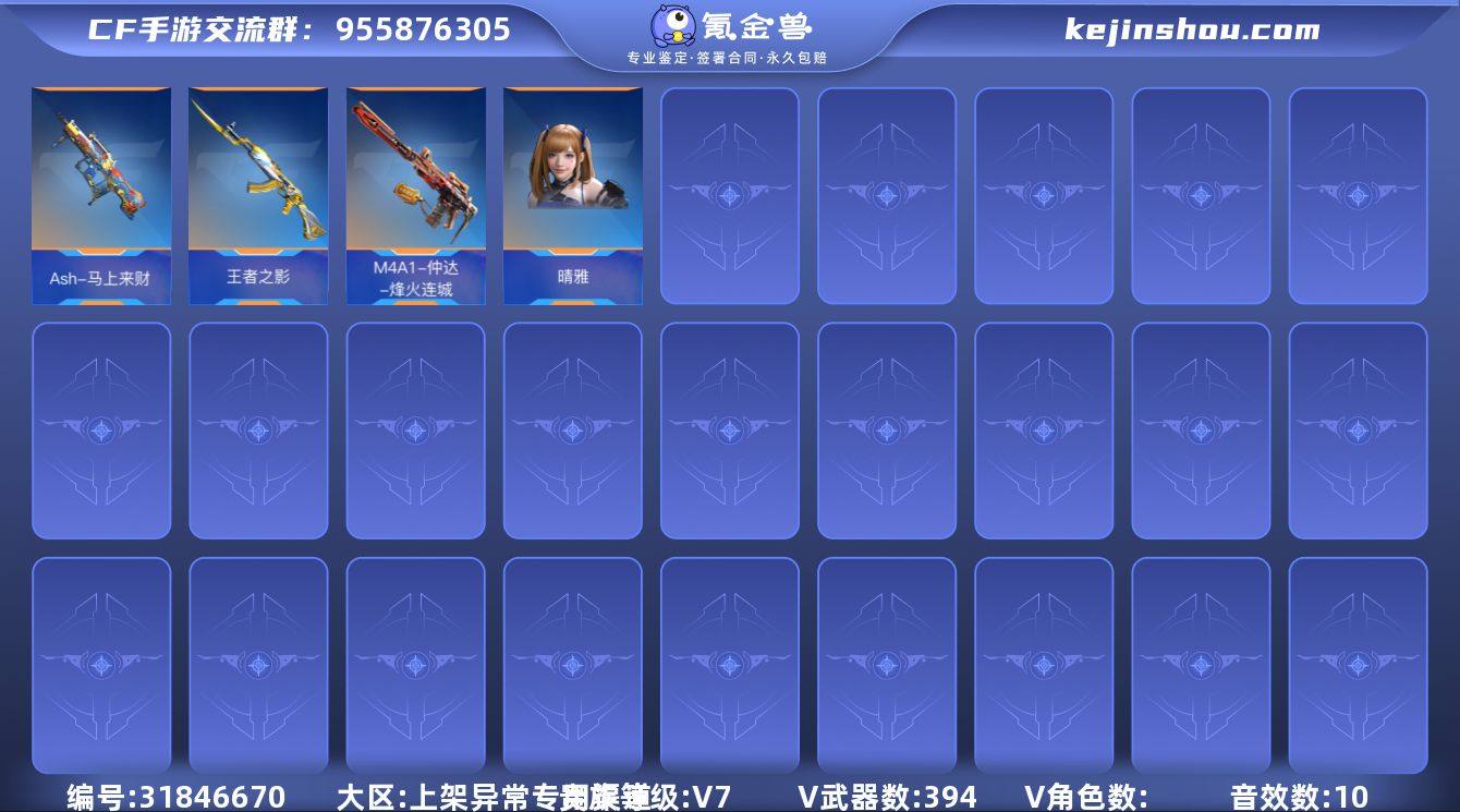 CF手游 准V8 成品号出售 - 贵族等级:准V8 - 英雄套装:仲达套装、盖套装、仲康套装、螳螂套装、孟获套装×2 - 英雄武器:仁德、妙才、幻神、TAC-晴舞、MK47云舞、M4星象、M4游骑兵(带皮肤)、斯泰尔蝴蝶、八一式光明之神、八一式机械纪元、AUG机械纪元、P90双脊龙、宙斯、MK23机械纪元、MK23极客、M12S雷霆王者、COP赤龙、尼泊尔雷霆、气勇胆烈戟 AN94超新星✘2 巴雷特-安琪拉 - 王者系列:王者之狱、王者之光、王者之霆、王者之影(冰霜皮肤)、王者之心、王者之击(冰霜皮肤)、3把王者之烈、王者之尊、王者之魂 - 音效卡 & 皮肤 & 语音卡:王者之光音效卡、毁灭音效卡、仲达音效卡+仲达皮肤、幻神音效卡、晴雅语音卡、云悠悠语音卡、雾萌萌语音卡 - 角色:晴雅、关小雨(带皮肤) - 投掷道具:云海游龙手雷×2、王者之圣烟雾弹、王者之圣闪光弹、王者之翼烟雾弹、王者之翼闪光弹、王者之影闪光弹、王者之影烟雾弹、游骑兵手雷套装生化竞技挑战三开花 账号说明:实名非本人,不可实名,无资料包赔,介意勿扰。商家可验证资产的真实性
