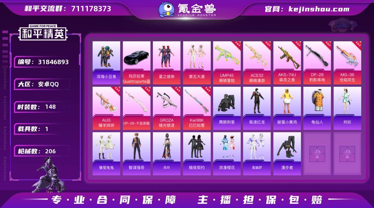 DYH18001安卓手Q-1载具-3粉装-10特效枪-148套装-206枪皮-9王牌印记-超级王牌-58482热力值 【1载具】玛莎拉蒂Quattroporte(夜幕蓝) 【3粉装】星之彼岸,第五大道,角色-千金淑猫 【10特效枪】DP-28-千金淑猫[7级],DP-28-豹影疾电[5级],Mk14-福马献瑞[5级],UMP45-萌骑冒险[1级],ACE32-萌骑漫游[3级],AUG-暖羊咩咩[5级],Kar98K-巳巳如意[5级],GROZA-镜光银凌[5级],MG-36-沧焰双生[5级],AKS-74U-森灵之息[5级] 【3稀有】TT战队服,小丑鱼,AKM-奇异狩猎者 【8飞行器】狂鲨锋刃飞行器,冰柠泡泡飞行器,异域银装飞行器,极意拳锋飞行器,云朵驼驼飞行器,鸡智如我飞行器,马上有福飞行器,登顶巅峰飞行器 【1头盔】幻影战神头盔 【1背包】甜蜜誓约背包 【338其它衣服和枪皮】冰川特警,SS30特训,SS33特训,冷焰舞者,蓝冰羽,幻世战舞者,紫幽梦,飞行日记,雏菊兔兔,角色-绯色魅影,风迹短诗,角色-风玲,战地督导,狙击之神,轻风白浪,SS26特训,SS36特训,战术大师,粉日山川,黄色名流,SS35特训,疯狂小兔子,朱霞炽焰,特战装甲,SS28特训,极地朋克,老实芭蕉,深蓝色名流,热情海星,玉兔迎春,SS25特训,角色-绛羽幽主,贵族骑装,光之冒险,黄色运动,角色-Mark.06,绯格组合,幻彩翩翩,青年教官,街头潮人,竞技角斗士,冰冻风暴,白糯汤圆,龙的传人,玲珑侠影,凌霄紫焰,SS21特训,异域银装,红色运动,红釉青花,雪国风尚,空岛之星,SS29特训,妙红点点,SS37特训,幻影武者,角色-无面战甲,黑色伏地魔,遗落祭司,蓝色运动,超能勇士,龟仙人,角色-阿虎,龙舌兰冰茶,暗黑骑手,SS23特训,SS31特训,春日漫步,鹰眼刺客,竞技达人朋克,森林游猎者,SS24特训,SS34特训,书海巡游,萌趣咩咩,竞技名士,极速红龙,特训学院,幻世保卫者,智谋强哥,阳光菠萝,浪漫樱花,福马献瑞,潮流炫酷,角色-阿奴,SS27特训,曼妙人鱼,蓝彩潮