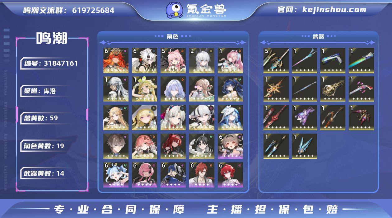 54金开服账号,80级,星声:142,余波珊瑚:4,19个五星角色:满命凌阳, 满命奥古斯塔, 5命安可, 2命赞妮, 1命维里奈, 1命卡卡罗, 1命爱弥斯, 鉴心, 吟霖, 长离, 相里要, 守岸人, 椿, 珂莱塔, 菲比, 卡提希娅, 尤诺, 琳奈, 莫宁;12个四星角色:满命秧秧, 满命炽霞, 满命白芷, 满命秋水, 满命散华, 满命莫特斐, 满命渊武, 满命丹瑾, 满命桃祈, 满命釉瑚, 满命灯灯, 2命卜灵;13个五星武器:精1掣傀之手, 精1千古洑流, 精1赫奕流明, 精1擎渊怒涛, 精1诸方玄枢, 精1裁春, 精1死与舞, 精1焰光裁定, 精1不屈命定之冠, 精1驭冕铸雷之权, 精1相位涟漪, 精1永远的启明星, 精1源能机锋,七千多小珊瑚,背包里一个月卡武器自选箱