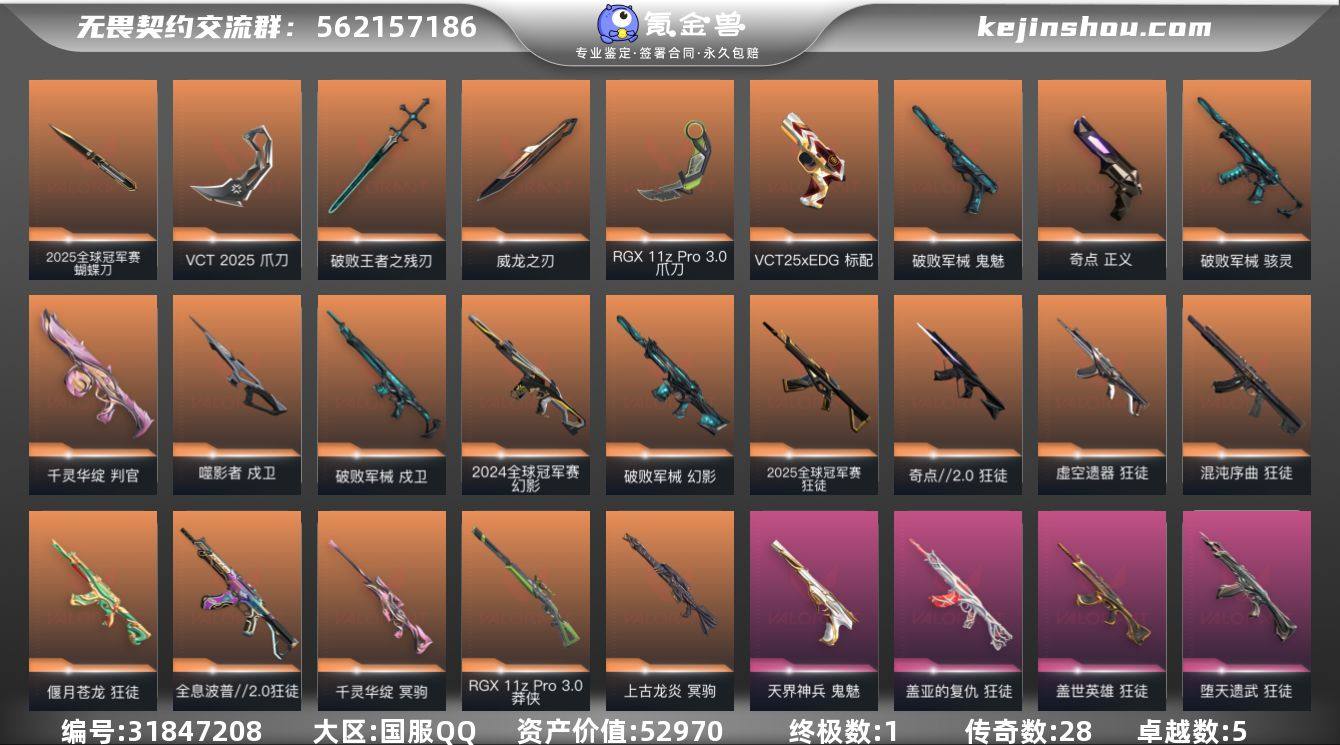 【套装】:2025全球冠军赛套装【英雄】:幻棱,炼狱,维斯,暮蝶,钛狐,壹决,铁臂,捷风,雷兹,幽影,不死鸟,贤者,猎枭,蝰蛇,零,芮娜,奇乐,尚勃勒,霓虹,斯凯,夜露,星礈,K/O,海神,盖可,黑梦,钢锁【近战武器】:近战武器-2025全球冠军赛 蝴蝶刀,近战武器-碎心裂刃,近战武器-剥皮小刀,近战武器-诡秘蛇影 军刀,近战武器-日耀风暴 遗器,近战武器-阿特拉斯指挥部 甩棍,近战武器-星际猎兵 短剑【狂徒】:狂徒-2025全球冠军赛,狂徒-混沌序曲,狂徒-机动狂飙,狂徒-虚空遗器,狂徒-RGX 11z Pro,狂徒-多弥尔的复仇,狂徒-耀鳞威龙,狂徒-紫阙金琅,狂徒-诡秘蛇影【幻影】:幻影-2022全球冠军赛,幻影-洪荒怒焰,幻影-电音光谱,幻影-ORA x 颗秒,幻影-源能者危机001,幻影-神中神罚,幻影-末日之翼,幻影-电音光谱【戍卫】:戍卫-掠影,戍卫-折光棱晶【獠犬】:獠犬-日冕雄师【冥驹】:冥驹-离子武器【飞将】:飞将-末日之翼【莽侠】:莽侠-RGX 11z Pro//3.0,莽侠-诡秘蛇影【奥丁】:奥丁-天界神兵//2.0,奥丁-末日之翼【判官】:判官-毁灭骑士,判官-诡秘蛇影【雄鹿】:雄鹿-起源【骇灵】:骇灵-奇点【蜂刺】:蜂刺-混沌序曲,蜂刺-折光棱晶【标配】:标配-折光棱晶【VCT手枪】:标配-VCT25 x 100T【正义】:正义-西部未来,正义-纳米打击【鬼魅】:鬼魅-破败军械,鬼魅-诡秘蛇影,鬼魅-星云暗涌【短炮】:短炮-末日之翼【卡面】:进入射程 卡面,精灵大战 卡面,南瓜盛典 卡面,无畏契约:暮蝶 卡面,修车达人 卡面,正义的化身 卡面,最高舞台 卡面,归乡 // 蝰蛇 卡面,树懒大作战 卡面,红鳞松叶 卡面,Clutch 卡面,梦幻奶茶 卡面,无畏契约:蝰蛇 卡面,无畏契约GO!第一卷:芮娜 卡面,无畏契约GO!第一卷:零 卡面,《双城之战》金克丝 卡面,无畏契约GO!第一卷:贤者 卡面,钢锁vs盖...