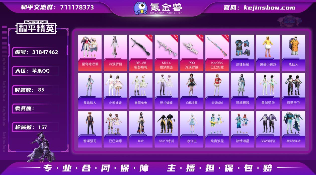 WJ808苹果手Q-2粉装-7特效枪-85套装-157枪皮-10王牌印记-超级王牌2星-42020热力值【2粉装】角色-冷漠罗丽,星穹咏叹调【7特效枪】Mk14-甜梦熊击[5级],Mk14-福马献瑞[5级],AKS-74U-森灵之息[5级],P90-冷漠罗丽[7级],DP-28-豹影疾电[5级],Kar98K-巳巳如意[5级],UMP45-萌骑冒险[3级]【12飞行器】冰柠泡泡飞行器,马上有福飞行器,登顶巅峰飞行器,荒原烈焰飞行器,炫彩糖果飞行器,云朵驼驼飞行器,顶峰精英尾迹,破刃行动尾迹,异域银装飞行器,空岛之星尾迹,鸡智如我飞行器,狂鲨锋刃飞行器【233其它衣服和枪皮】猛禽,蝶变,云朵鹅,SS37特训,星途旅人,迅捷狂鲨,雏菊兔兔,粉黛兰香,SS27特训,SS28特训,雪绒豹,星影赞美诗,角色-紫俏灵猫,角色-狂花道·娜可露露,竞技名士,SS30特训,小熊娃娃,彩虹兔,福马献瑞,热情海星,阳光菠萝,炫彩糖果,角色-曹焱兵,狙击之神,青春校园,SS29特训,王牌教练,异域银装,海岛探路者,旭日情侣,狂鲨锋刃,萝兰蝴蝶,马上来财,海盐绵绵冰,角色-乐音,角色-灵公主,SS36特训,街头潮人,角色-时希公主,白色伏地魔,恋语绒绒,缤纷果语,香桃花海,薄荷星砂,顶瓜瓜,黑色伏地魔,雨过天青,青翼流星,燕燕于飞,战术大师,萌鸡速递,白糯汤圆,魅力单车,SS32特训,角色-风玲,角色-冰公主,SS33特训,霓虹热舞,粉恋花,红釉青花,黄色伏地魔,破蛋小黄鸡,黄色名流,SS34特训,SS35特训,紫幽梦,老实芭蕉,鱼渊荷华,巳巳如意,长空猛禽,智谋强哥,龟仙人,街头风暴,元气之梦,冰河战士,黄色运动,幻世战舞者,雪国风尚,纯真浪花,SS31特训,蓝冰羽,空岛之星,角色-海琴烟,S686-巳巳如意,Mk14-薄荷星砂,平底锅-紫幽梦,平底锅-属我最6,SCAR-L-彩虹符号,SCAR-L-海盐豹豹,蝎式手枪-燕燕于飞,燃烧瓶-甜梦桃焰,撬棍-冰晶雪宝,AMR-鬼刀,平底锅-空岛之星,沙漠之鹰-雨过天青,Win94-拳皇·狂花道,S12K-极意拳锋,AKS-74U