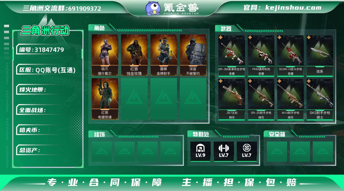 YQ-总资产268m/哈夫币21m/部门33333 【蚀金玫瑰/维什戴尔/信条/荼蘼/缄花/鹅鸭杀套 深蓝-不破誓约 露娜-运动员 仓库9级 训中满级 靶场满级 aw*73 黑夜猎手 黄金鸟窝纪念】 等级 60 烽火段位 黄金IV 橙:PKM荼蘼,SR荼蘼,SCAR荼蘼,M14缄花,SR缄花,.357缄花,M4A1蚀金玫瑰,M14蛮荒,SKS骑士,KC17电锯惊魂,SG552运动员,P90信条,SR信条,腾龙死神玫瑰,G3骑士,M4A1阿米娅,CAR阿米娅,M250骑士之心,ASh鹅鸭杀,QCQ鹅鸭杀,QJB鹅鸭杀,R93维什戴尔,SCAR启航, 刀:近战信条, 限时道具/段位以实际验号为准。如账号因没有维护,赛季更新等不可抗因素发生变化,不属于账号质量问题差""