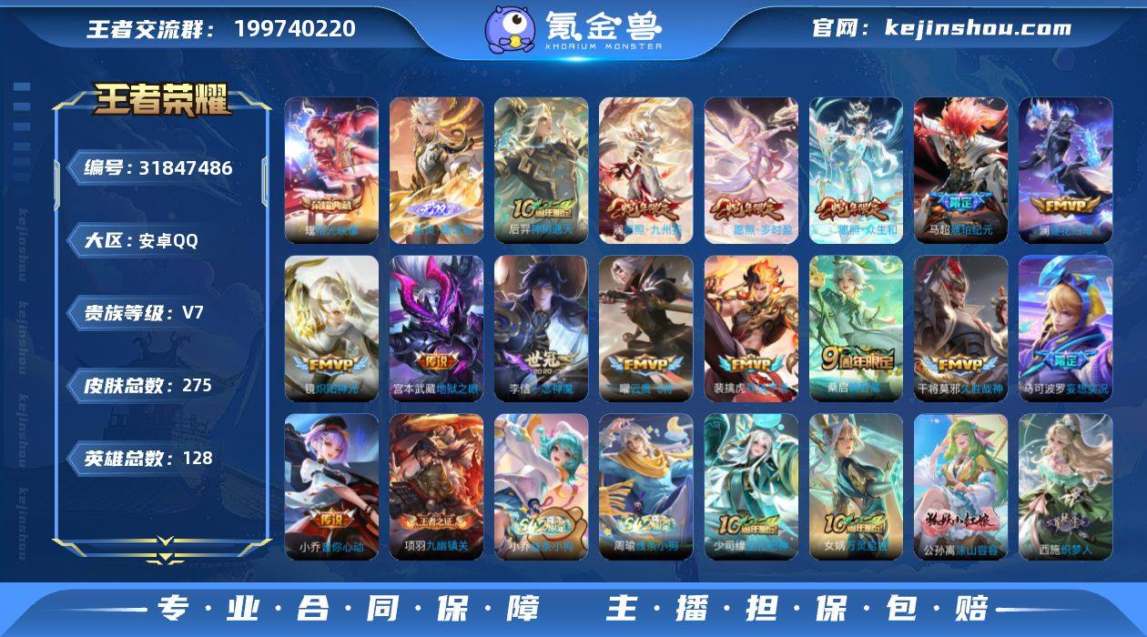 安卓Q-V7-最强王者段位-128英雄-275皮肤-1典藏皮肤-1无双-1珍品传说-16传说-73史诗【英雄全皮】:孙权全皮,敖隐全皮,赵怀真全皮,戈娅全皮,影全皮【荣耀典藏】:瑶拾光映像【无双皮肤】:曜器灵螭龙剑【传说皮肤】:后羿神树通天,妲己愿照众生和,澜愿照九州拓,虞姬愿照岁时盈,裴擒虎祥瑞亨通,桑启鸣野蒿,马超琥珀纪元,澜逐花归海,马可波罗妄想实况,小乔音你心动,镜炽阳神光,曜云鹰飞将,李信一念神魔,干将莫邪久胜战神,宫本武藏地狱之眼【限定皮肤】:蒙犽顽岩魄,蔡文姬夏日便利店,大乔绒语心约,虞姬夏日便利店,姜子牙天穹之誓,狄仁杰阴阳师,赵云皇家上将,赵云引擎之心,扁鹊奇幻香踪,元歌无心,马可波罗妄想实况,狄仁杰魔术师,达摩沙漠行僧,项羽海滩派对,兰陵王驯魔猎人,兰陵王金庭之子,杨戬潮玩骑兵,干将莫邪胡桃夹子,太乙真人华丽摇滚,百里玄策原初追逐者,沈梦溪大漠名商,裴擒虎擒涛扼浪,云中君纤云弄巧,上官婉儿梁祝,西施玲珑珍味,鲁班大师探海日志,桑启海盐诗旅,戈娅驭风魔法,艾琳流音漫舞,赵怀真鹤归松栖,司空震地狱燃心,阿古朵江河有灵,张良古海寻踪,高渐离燃音魔法,妲己灵卜魔法,鬼谷子天穹祈灯,马超琥珀纪元,姬小满妄想食味,百里玄策超元猎域,沈梦溪龙舞盛年,鲁班七号蔬乡物语,李元芳蔬乡物语,刘邦剑破天穹,程咬金群星魔术团,镜青焰无极,项羽苍威无极,刘备异域游侠,周瑜熔金海岸【赛季限定】:达摩沙漠行僧,兰陵王金庭之子,张良古海寻踪,百里玄策原初追逐者,沈梦溪大漠名商,裴擒虎擒涛扼浪,鲁班大师探海日志,桑启海盐诗旅,鬼谷子天穹祈灯,刘邦剑破天穹,姜子牙天穹之誓【战令限定】:蔡文姬夏日便利店,虞姬夏日便利店,扁鹊奇幻香踪,兰陵王驯魔猎人,艾琳流音漫舞,杨戬潮玩骑兵,西施玲珑珍味,司空震地狱燃心,戈娅驭风魔法...
