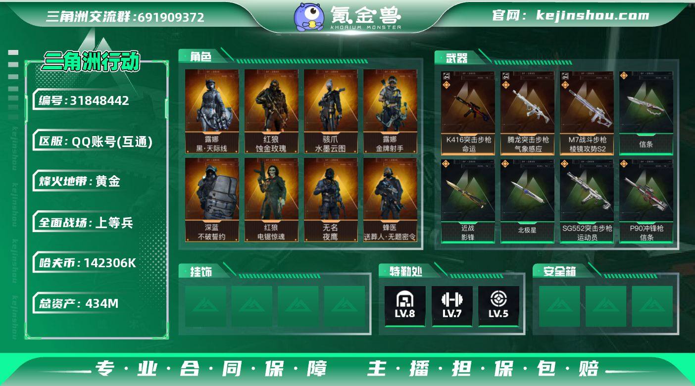 【高氪金土豪号-高额资产434M-三红皮+三刀皮+一三把典藏皮肤,纯现金142M】【北极星.影锋.信条.蚀金玫瑰.水墨云图.黑天际线】【典藏外观】:K416突击步枪-命运(优品B)腾龙突击步枪-气象感应(优品S)M7战斗步枪-棱镜攻势S2(优品B)【Q区三端互通】【无二次协助处理】YXz7273-特勤处:仓库8级/靶场5级/训练中心7级-总资产434m-哈夫币142m-烽火等级:60级 【干员外观】:红狼-蚀金玫瑰,骇爪-水墨云图,露娜-黑·天际线,蜂医-送葬人·无题密令,无名-夜鹰,深蓝-不破誓约,红狼-电锯惊魂,露娜-金牌射手 【近战皮肤】:近战-影锋,近战-北极星,近战-信条,近战-黑鹰 【典藏外观】:K416突击步枪-命运,腾龙突击步枪-气象感应,M7战斗步枪-棱镜攻势S2 【传说外观】:M4A1突击步枪-蚀金玫瑰,M4A1突击步枪-阿米娅,AKM突击步枪-流光铂影,ASh-12战斗步枪-鹅鸭杀,M16A4突击步枪-狩猎时刻,SG552突击步枪-运动员,AK-12突击步枪-夜鹰,AK-12突击步枪-特斯拉线圈,SCAR-H战斗步枪-水墨云图,SCAR-H战斗步枪-启航,G3战斗步枪-流光铂影,G3战斗步枪-狩猎时刻,CAR-15突击步枪-阿米娅,AS Val突击步枪-死神玫瑰,腾龙突击步枪-死神玫瑰,K437突击步枪-北极星,KC17突击步枪-电锯惊魂,P90冲锋枪-信条,Vector冲锋枪-狩猎时刻,UZI冲锋枪-流光铂影,UZI冲锋枪-特斯拉线圈,SR-3M紧凑突击步枪-特斯拉线圈,勇士冲锋枪-能天使-午夜邮差,QCQ171冲锋枪-北极星,QCQ171冲锋枪-鹅鸭杀,M1014霰弹枪-影锋,S12K霰弹枪-死神玫瑰,725双管霰弹枪-送葬人-无题密令,M250通用机枪-骑士之心,QJB201轻机枪-鹅鸭杀,M14射手步枪-电锯惊魂,SR-25射手步枪-信条,AWM狙击步枪-影锋,复合弓-黑·天际线 【史诗外观】:MP7冲锋枪-原型机,K437突击步枪-私人定制*2,AWM狙击步枪-私人定制*3,AKM突击步枪-林中猎手,QBZ95-1突击步枪-曙光,...