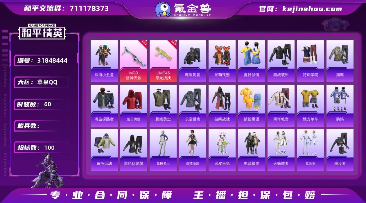 HX9051【女号身法素材号-1稀有8特效枪2粉装-异瞳寒姬 流光夜莺 角色-紫俏灵猫 角色-绯色魅影】可二次 苹果Q-1稀有1粉装8特效枪9热门62套装100枪皮 25519热力值 3印记 历史超级王牌 【1稀有】 AKM-缤纷海域 【2粉装】 异瞳寒姬 流光夜莺【8特效枪】 AKS-74U-森灵之息 (5级) Kar98K-巳巳如意 (5级) DP-28-豹影疾电 (5级) MG3-洛神天依 (5级) AKS-74U-森灵之息 (5级) Mk14-福马献瑞 (2级) ACE32-萌骑漫游 (4级) UMP45-恐龙拽拽 (6级) 【9热门】角色-紫俏灵猫 角色-绯色魅影 龟仙人 呆萌铁蟹 鹰眼刺客 深海小丑鱼 忍者信条 漫步者 破蛋小黄鸡 极速红龙 弄潮海豚 【2头盔】 幻影战神头盔 深海小丑鱼头盔 【1背包】 深海小丑鱼背包苹果Q区-1粉装-6特效枪-25519热力值-3王牌印记-62套装-100枪皮【优质套装】: 异瞳寒姬【特效枪等级】:UMP45-恐龙拽拽(六级- UMP45-恐龙拽拽)MG3-洛神天依(五级- MG3-洛神天依)【优质武器皮肤】: UMP45-恐龙拽拽 MG3-洛神天依【稀有武器皮肤】: SCAR-L-海盐豹豹 GROZA-海盐豹豹 UMP45-恐龙拽拽 MG3-洛神天依 PKM-紫幽梦 Mk14-紫幽梦 蜜獾-乌木金纹 S1897-紫幽梦 P92-紫幽梦 SCAR-L-夜灯 SCAR-L-炫彩节奏 M16A4-幻世战舞者 GROZA-影袭 QBZ-洛神天依 Mk47-洛神天依 蜜獾-天降萌叽 Kar98K-洛神天依 M24-影袭 UZI-影袭 UMP45-生命誓言 UMP45-夜灯 S12K-夜灯 MG3-幻世战舞者 AUG-异域银装 十字弩-异域银装 SPAS-12-乌木金纹 Mini14-香桃花海【其他套装】: 蓝冰羽 异瞳寒姬 深海小丑鱼 白糯汤圆 特训学院 猎鹰 青年教官 黄色运动 顽皮玉兔 漫步者 黑色伏地魔 竞技名士 长空猛禽 特战装甲 旭日情侣 魅力单车 鹰眼刺客 冰冻风暴 超能勇士 海岛探路者 破晓战魂