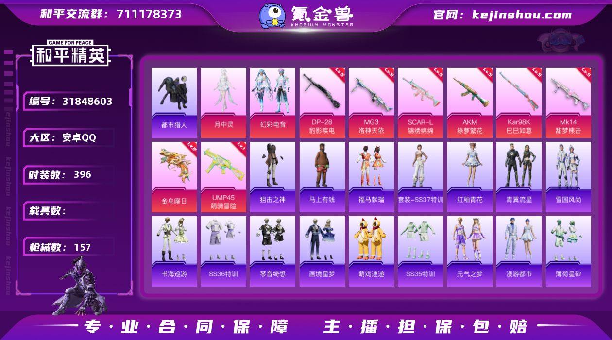 实名:可二次实名 是否支持人脸包赔:支持 粉装数量:2 特效枪数量:8 时装数:396 枪械数:157 都市猎人 月中灵,幻彩电音 五级DP-28-豹影疾电,五级AKM-绿萝繁花,五级Kar98K-巳巳如意,五级MG3-洛神天依,五级MK14-甜梦熊击,五级SCAR-L-锦绣绵绵,二级信号枪-金乌曜日,一级UMP45-萌骑冒险 狙击之神,马上有钱,福马献瑞,红釉青花,SS37特训,雨过天青,青翼流星,雪国风尚,画境星梦,琴音绮想,书海巡游,SS36特训,炫彩糖果,萌鸡速递,SS35特训,元气之梦,漫游都市,薄荷星砂,云魄琉璃,SS34特训套装,暗黑骑手,暗金炫舞,冰川特警,冰冻风暴,冰河战士,白糯汤圆,白色伏地魔,春光漫游,长空猛禽,晨曦薄雾,纯真浪花,大橘大利,都市猎人,电音精灵,绯格组合,龟仙人,海岛探路者,鹤鸣,湖蓝色名流,幻世保卫者,极地朋克,惊鸿侠骨,竞技角斗士,竞技名士,锦衣飞扬,空岛之星,快闪甜心,龙的传人,龙魂突击队,蓝色运动,冷焰舞者,漫步者,魅力单车,懵萌河马,曼妙人鱼,柠萌假日,牛气满满,破蛋小黄鸡,青春校园,绮丽涂鸦,青涩时光,云朵鹅,热情海星,神气柴柴,SS23特训,SS24特训,SS25特训,SS26特训,SS27特训,SS28特训,SS29特训,SS30特训套装,SS31特训套装,SS32特训套装,SS33特训套装,巳巳如意,天籁歌者,特训学院,铁血战翼,团圆交子,特战装甲,完美偶像,王牌教练,小丑鱼,雪绒豹,香桃花海,星途旅人,雨林探路者,玉兔迎春,英勇保护者,鹰眼刺客,异域银装,智谋强哥 炫彩糖果飞行器,炫彩糖果降落伞,初号机 觉醒Ver.降落伞,创世·救赎降落伞,洛神天依降落伞,炫光之旅降落伞