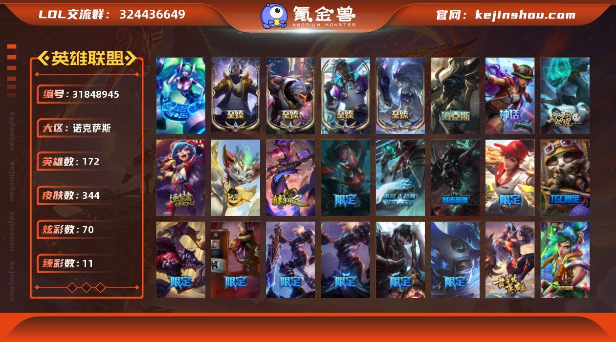 【LOLD68】172英雄/344皮肤/1终极/10神话/48限定/11臻彩/70炫彩/40传说/63史诗/铂金账号等级:696/10周年 安妮/源代码 乐芙兰/十五周年纪念 希维尔/10周年庆典 凤凰/海克斯 人马/至臻 真实伤害 亚索/至臻 青花瓷 千珏/至臻 星之守护者 艾克/至臻 源计划:阴 劫/觅心游侠卢锡安/玉剑传说寒潭夭夭/至臻蒙面女郎莫甘娜/天龙之子 卡莎 飞龙乘云/无畏骑士 瑟庄妮 赤子初心/黎明使者 锐雯 黑夜使者/星之守护者 金克丝 黑洞/魔女 阿卡丽 虚荣/净雪之月 莫甘娜 冬虹/这货不是银狐-库奇/花仙子 崔丝塔娜 蓝闪/碧玉之牙 卡西奥佩娅/玉净夜叉 凯特琳/天龙之子 斯莫德/踏雪寻梅卡特琳娜/踏雪寻梅杰斯/龙马烈焰波比/圣诞精灵 崔丝塔娜/狂心冰王 图奇/邪恶圣诞老人 维迦/圣诞玩偶 波比/圣诞老人 酒桶/魄罗骑士 瑟庄妮/冰雪女神 辛德拉/冰雪兽 纳尔/DJ-娑娜/创星之灵 璐璐/送披萨的小姐姐 希维尔/地底世界 崔斯特/冠军之刃 锐雯/冠军之刃 锐雯 2016/S1FNC 嘉文四世/S3 SKT T1 李青/S6 SKT T1 球女/SSG霞/S8 IG 菲奥娜/S8 IG 艾瑞莉娅/S8 IG 卡密尔/S8 IG 卡莎/S9 FPX 锤石/4周年 锐雯/5周年 阿狸/暗裔英雄 盖伦/胜利之剑 亚托克斯/胜利枪神 卢锡安/胜利女神 娑娜/胜利剑圣 易/胜利之运 崔斯特/胜利女神-菲奥娜/鬼影森森 茂凯/泳池派对 格雷福斯/泳池派对 蕾欧娜/密林猎手 提莫/暗影 沃里克/都铎王朝 图奇/玉剑传说 舞龙卫/征服者 诺提勒斯/防暴士兵 辛吉德/双城之战2 幸存者 杰斯/铁哥们儿 奥拉夫/地狱之门卫士 加里奥/战地机甲 厄加特/战场女武神 凯尔/约德尔国队长 提莫/幻灵战斗队长 厄运小姐/女皇 艾希/源计划:联合 艾希/西部天使 艾希/绅士 科加斯/盒子猫 萨科/律政大亨 蒙多/未来战士 凯特琳/冰川巨兽 墨菲特/女帝 卡特琳娜/上古战魂 魔腾/丧尸 布兰德/神龙尊者 圣龙李青/源计划:净化 薇恩/炼狱魔犬 内瑟斯/源计划:超体...