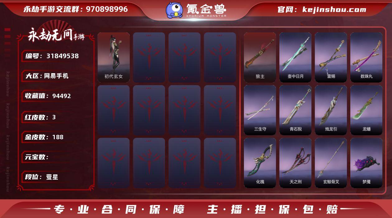 3红色神品: 初代玄女/赤皓新囍/狼主.,初代玄女(宁红夜),时装-夜华朝,时装-昆仑圣女,时装-九阴圣女,时装-碧水青天,发型-簪缨,头部-雁落笠,时装-鱼皮甲·蓝旗,时装-耀光天狼,头部-战狼弯角盔,腰部-御狼号角,腰部-狼首腰扣,时装-掌珠仙子,时装-怒浪,背部-雾海龙王,发型-碎浪,发型-挽浪,腰部-海月,时装-八宝龙王,时装-浣烟纱,时装-神鹰之女,时装-惊云羽,时装-魅灵孤鹰,发型-夕鹰,时装-狂虎,时装-阴阳姬,时装-御宅罗梦,时装-叠裙·水仙,头部--立乌帽,腰部-破魔矢,腰部-蓝樱灯,时装-奉生者,发型-泽兰,壶中日月,三生守,数珠丸,雷赐,狼主(阔刀),青石猊,龙蟠,烛龙引,玄鲸骨叉,化魄,天之刑,梦魇,古月,腥红之月,乌木弓,镇海,玄武,龙啸,石中火【宁红夜】初代玄女/赤皓新囍/夜华朝/昆仑圣女/九阴圣女/西行劫蜘蛛精/碧水青天/簪缨/雁落笠/美团团上头了/暖冬帽/封神录云渺/周年应援 【特木尔】耀光天狼/怪诞狂想致命玩笑/战狼弯角盔/美团团上头了/暖冬帽/御狼号角/狼首腰扣/周年应援 【崔三娘】掌珠仙子/怒浪/雾海龙王/碎浪/挽浪/美团团上头了/暖冬帽/海月/周年应援 【顾清寒】南山翠暖/广寒仙/琼花帽/美团团上头了/暖冬帽/周年应援 【玉玲珑】流星群侠传凤儿/昭华/美团团上头了/暖冬帽/周年应援 【刘炼】金瑛冠/美团团上头了/暖冬帽/天机/周年应援 【天海】八宝龙王/冬日绮韵白熊/冬日绮韵熊熊头/美团团上头了/暖冬帽/冬日绮韵气球/周年应援 【岳山】西行劫杨戬/过江龙/美团团上头了/暖冬帽/2674赤徽/周年应援 【沈妙】悠竹萌客/奥村春NOIR/娇憨发/美团团上头了/暖冬帽/周年应援/P5R·NOIR面具 【魏轻】美团团上头了/暖冬帽/判官簿/周年应援 【万钧】美团团上头了/暖冬帽/骤雷镖旗/周年应援 【迦南】浣烟纱/神鹰之女/赤翎之约/惊云羽/魅灵孤鹰/赤雀发/夕鹰/摩诃宝冠/美团团上...