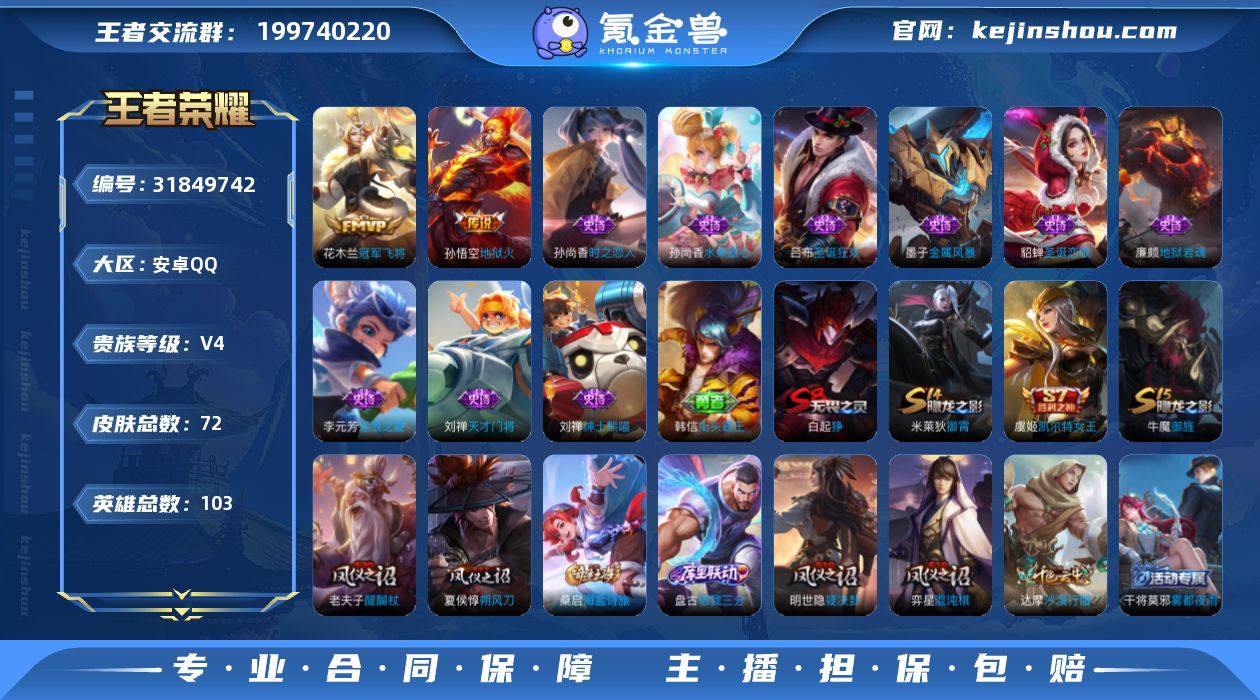 安卓Q-V5-至尊星耀II段位-100英雄-87皮肤-4传说-24史诗 【英雄全皮】:影全皮 【传说皮肤】:桑启鸣野蒿,露娜霜月吟,花木兰冠军飞将,狄仁杰超时空战士 【限定皮肤】:姜子牙天穹之誓,狄仁杰阴阳师,赵云皇家上将,项羽海滩派对,沈梦溪星空之诺,上官婉儿梁祝,上官婉儿神器万象笔,嫦娥如梦令,阿古朵江河有灵,张良古海寻踪,鬼谷子天穹祈灯,伽罗琥珀纪元,安琪拉乘龙聚宝船,沈梦溪龙舞盛年,刘邦剑破天穹 【年限皮肤】:安琪拉乘龙聚宝船 【赛季限定】:张良古海寻踪,鬼谷子天穹祈灯,刘邦剑破天穹,姜子牙天穹之誓,东皇太一噬灭天穹,太乙真人谧流熔炉 【战令限定】:沈梦溪星空之诺,亚连破空之剑,孙悟空神迹守卫,周瑜线条小狗 【史诗皮肤】:上官婉儿春霖将至,周瑜线条小狗,阿轲化蝶舞,亚连破空之剑,安琪拉乘龙聚宝船,伽罗琥珀纪元,阿古朵江河有灵,上官婉儿神器万象笔,貂蝉唤灵魅影,西施诗语江南,嫦娥如梦令,上官婉儿梁祝,公孙离无限星赏官,狄仁杰鹰眼统帅,白起星夜王子,李元芳逐浪之夏,兰陵王暗隐猎兽者,吕布末日机甲,曹操幽灵船长,妲己魅力维加斯,嬴政暗夜贵公子,孙尚香水果甜心,宫本武藏鬼剑武藏,貂蝉圣诞恋歌,赵云皇家上将 【其他皮肤】:刘备浪漫序章,戈娅玫蓝誓约,影魅影绮裳,太乙真人谧流熔炉,东皇太一噬灭天穹,孙悟空神迹守卫,姜子牙天穹之誓,刘邦剑破天穹,扁鹊无尽旅途,钟无艳春野之旅,沈梦溪龙舞盛年,嫦娥漠中幻影,海诺时空谍影,鬼谷子天穹祈灯,后羿完美运算,亚连破局者,钟无艳聚星闪耀,张良古海寻踪,海月幻泉雾影,露娜瓷语鉴心,刘禅秘密基地,鲁班七号黑桃队长,沈梦溪星空之诺,孙膑归虚梦演,大乔守护之力,狂铁命运角斗场,王昭君幻想奇妙夜,关羽龙腾万里,刘备汉昭烈帝,狄仁杰阴阳师,后羿阿尔法小队,宫本武藏万象初新,甄姬花好...