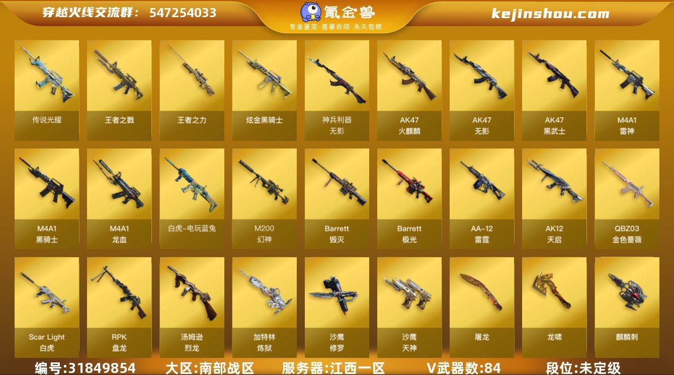 江西一区-88V-11王者-1炫金【6烈龙】【斯泰尔-蝴蝶】【死亡之眼】【6盘龙】【炼狱-迷你小钢】【幻灵】【雷暴】【夜】【雷】【传说光耀】【M200-幻神】【M200-幻神音效卡】【Scar Light-白虎】【Scar Light-白虎-暗星】【白虎-电玩粉兔皮肤】【Scar Light-白虎音效卡】【白虎-电玩蓝兔】【QBZ03-金色蔷薇】【QBZ03-金色蔷薇音效卡】【炼狱-迷你小钢】【加特林-炼狱】【RPK-盘龙】【魂·炼狱-玩具枪】【汤姆逊-烈龙】【斯泰尔-蝴蝶】【死亡之眼】【迷迭香】【乔伊教练】【王者-零】【王者-瞳-闭月羞花】【王者-魅影】【炫】【魅影】【M4A1-雷神】【雷神-赛博朋克】【雷神-耀金皮肤】【雷神-星空】【雷神-暗月】【M4A1-雷神音效卡】【AK47-火麒麟】【火麒麟-冠军之心】【火麒麟-巅峰荣耀】【火麒麟-心动糖果】【火麒麟-CFSTAR】【火麒麟-雷神】【AK47-火麒麟音效卡】【M4A1-黑骑士】【黑骑士-少林】【黑骑士耀金皮肤】【黑骑士-摸金校尉】【黑骑士-电玩青兔皮肤】【M4A1-黑骑士音效卡】【黑龙-能量核心】【Barrett-毁灭】【毁灭耀金皮肤】【Barrett-毁灭音效卡】 【传说武器】:传说光耀 【热门武器】:传说光耀,QBZ03-金色蔷薇,Scar Light-白虎,M200-幻神,死亡之眼,白虎-电玩蓝兔,炼狱-迷你小钢,M4A1-黑骑士,汤姆逊-烈龙*6,RPK-盘龙*6,加特林-炼狱*5,斯泰尔-蝴蝶,沙鹰-修罗*3 【王者炫金武器】:炫金骑士,王者之戮,王者之力 【音效卡】:M200-幻神音效卡,AK47-火麒麟音效卡,M4A1-雷神音效卡,M4A1-黑骑士音效卡,Barrett-毁灭音效卡,Barrett-极光音效卡,QBZ03-金色蔷薇音效卡,Scar Light-白虎音效卡 【稀有皮肤】:Scar Light-白虎-暗星,白虎-电玩粉兔皮肤,雷神-星空,雷神-耀金皮肤,火麒麟-冠军之心,火麒麟-巅峰荣耀,火麒麟-心动糖果,毁灭耀金皮肤,AWM-天龙-传奇70KG*2,无影耀金皮肤,AK...