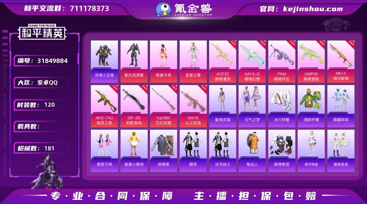 M1046582安卓手Q-3粉装-10特效枪-120套装-181枪皮-1王牌印记-坚韧铂金Ⅳ-51302热力值【3粉装】角色-歌者泠鸢,角色-圣堂之誓,角色-复仇流浪者【10特效枪】Mk14-福马献瑞[5级],UMP45-萌骑冒险[2级],AKS-74U-森灵之息[5级],PKM-萌骑夺宝[2级],Kar98K-巳巳如意[5级],DP-28-豹影疾电[5级],M416-心之恋语[7级],ACE32-萌骑漫游[1级],AA12-G-萌骑幻想[2级],蜜獾-荧海星豚[6级]【2稀有】小丑鱼,暗影哥特【6飞行器】粉色滑翔尾迹,花傲天飞行器,空岛之星尾迹,极意拳锋飞行器,英伦信使飞行器,顶峰精英尾迹【286其它衣服和枪皮】极地朋克,猛禽,战术大师,红色运动,牛气冲天,巳巳如意,霓虹街区,娇憨猪猪,锦衣飞扬,竞技达人朋克,SS22特训,福马献瑞,SS20特训,SS17特训,SS24特训,深蓝色名流,神气柴柴,龟仙人,鱼渊荷华,SS33特训,长空猛禽,角色-冰公主,冷焰舞者,湖蓝色名流,白糯汤圆,龙的传人,SS23特训,蓝色运动,凌霄紫焰,光之冒险,冰河战士,缤纷果语,轻风白浪,妙红点点,蝶变,牛气满满,惊鸿侠骨,SS30特训,角色-白光莹,SS27特训,酒红色名流,马上有钱,海岛探路者,旭日情侣,冰冻风暴,贝斯之夜,黄色名流,热情海星,幻彩翩翩,飞行日记,薄荷星砂,耀粉歌者,元气之梦,疯狂小兔子,街头潮人,竞技名士,SS31特训,快闪甜心,特训学院,SS26特训,狙击之神,雨林探路者,清新柠檬,破蛋小黄鸡,SS35特训,萌鸡速递,黄色运动,田园牧歌,燃烧卡路里,SS19特训,SS34特训,弄潮海豚,萝兰蝴蝶,绯格组合,SS36特训,海盐绵绵冰,角色-曹焱兵,麻辣教官,森林游猎者,魅力单车,智慧隐士,朱霞炽焰,柠萌假日,猎鹰,燕燕于飞,黑色伏地魔,SS28特训,SS29特训,SS37特训,角色-紫俏灵猫,探宝勇士,大橘大利,黄色伏地魔,空岛之星,王牌教练,红釉青花,粉红小猪,萌趣咩咩,幻影武者,玲珑侠影,雏菊兔兔,晨曦薄雾,街头风暴,冰川特警,幻世战舞者,春光漫