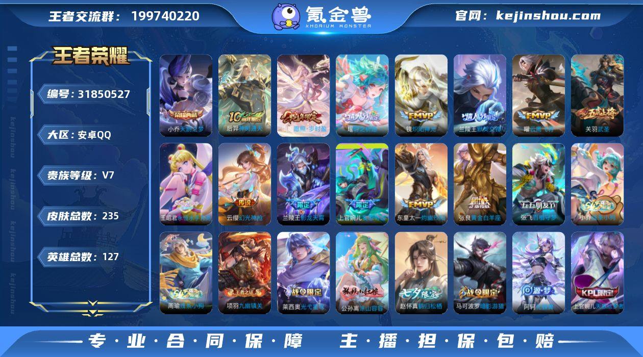贵族等级:V7 典藏皮肤数:1 珍品无双皮肤数:0 无双皮肤数:0 珍品传说皮肤数:0 传说皮肤数:14 史诗皮肤数:64 皮肤数:235 英雄数:127 段位:荣耀王者 卖家说:背包里还有一个荣耀水晶没用