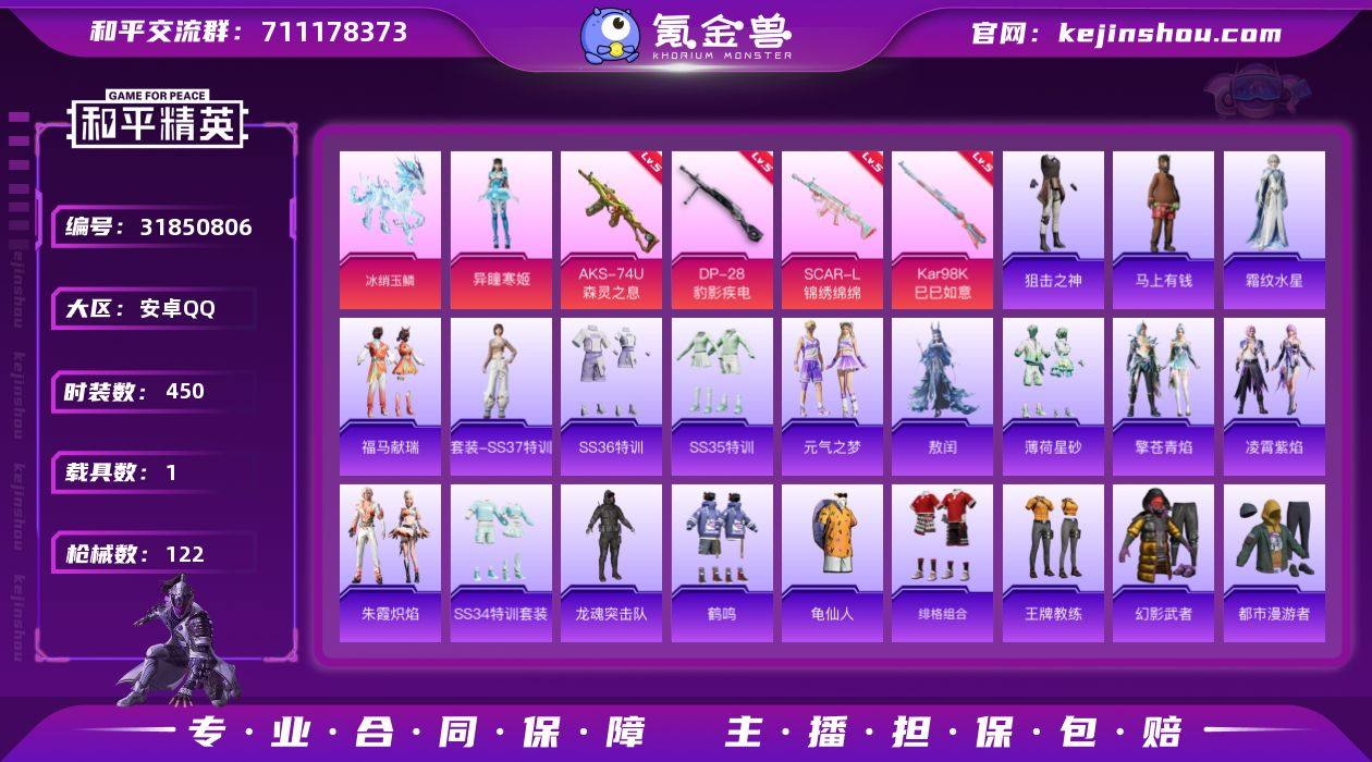 实名:不可二次实名 是否支持人脸包赔:支持 粉装数量:1 特效枪数量:4 载具数:1 时装数:450 枪械数:122 异瞳寒姬 五级AKS-74U-森灵之息,五级DP-28-豹影疾电,五级Kar98K-巳巳如意,五级SCAR-L-锦绣绵绵 冰绡玉鳞 狙击之神,马上有钱,福马献瑞,霜纹水星,SS37特训,SS36特训,SS35特训,元气之梦,敖闰,薄荷星砂,凌霄紫焰,擎苍青焰,SS34特训套装,朱霞炽焰,缤纷果语,冰公主,冰河战士,白糯汤圆,白色伏地魔,长空猛禽,潮流炫酷,顶瓜瓜,蝶变,都市魅力,都市漫游者,电音精灵,绯格组合,粉红小猪,格斗先锋,龟仙人,光之冒险,海岛探路者,鹤鸣,湖蓝色名流,黑色伏地魔,黄色伏地魔,黄色名流,黄色运动,红色运动,幻世战舞者,幻羽潜行,幻影武者,酒红色名流,橘黑制服,竞技达人朋克,竞技名士,吉莉礼服,极速红龙,街头潮人,街头风暴,酷潮明星,蓝彩潮人,龙的传人,龙魂突击队,猎鹰,六六大吉,蓝色运动,恋语绒绒,冷焰舞者,猛禽,魅力单车,弄潮海豚,柠萌假日,牛气满满,破蛋小黄鸡,破晓战魂,绮丽涂鸦,青年教官,青涩时光,人气偶像,深蓝色名流,SS19特训,SS20特训,SS21特训,SS22特训,SS23特训,SS24特训,SS25特训,SS26特训,SS27特训,SS28特训,SS29特训,SS30特训套装,SS31特训套装,SS32特训套装,SS33特训套装,巳巳如意,探宝勇士,甜蜜告白,特训学院,完美偶像,王牌教练,炫蓝之夏,夏日音浪,香桃花海,星途旅人,星渊小夜曲,耀粉歌者,玉兔迎春,野性山猫,焰鹰斗篷,幽夜迷踪,耀眼新星,战地督导,智谋强哥,灼焰舞者 灵珠游龙飞行器,虹云熊熊降落伞,罪夜之冕降落伞,魔童闹海 敖丙降落伞,萌酷奶龙降落伞