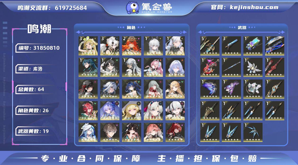 鸣潮成品号基本全角色练度基本毕业,命座和皮肤不少可以看看,这号很欧基本没歪过有连金。现在缺钱所以出了,感兴趣的可以看看。拉海洛地图都没肝过,首充双倍也有。