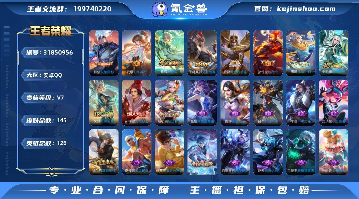 【特价出售/店主推荐】安卓Q-V7-至尊星耀V段位-126英雄-145皮肤-1典藏皮肤-5传说-32史诗 【荣耀典藏】:韩信弑枪猎影 【传说皮肤】:云缨幻光神枪,桑启鸣野蒿,干将莫邪久胜战神,后羿黄金射手座,孙悟空地狱火 【限定皮肤】:狄仁杰阴阳师,赵云皇家上将,吕布猎兽之王,夏侯惇朔风刀,典韦穷奇,狄仁杰魔术师,狄仁杰万华元夜,项羽海滩派对,老夫子醍醐杖,程咬金演武夺筹,孙悟空大圣娶亲,牛魔御旌,李元芳银河之约,钟馗驱傩正仪,鬼谷子原初探秘者,弈星混沌棋,沈梦溪星空之诺,明世隐疑决卦,裴擒虎擒涛扼浪,米莱狄御霄,盾山御銮,鲁班大师探海日志,张良古海寻踪,蒙恬荣光圣徽,鬼谷子天穹祈灯,姬小满妄想食味,沈梦溪龙舞盛年 【赛季限定】:典韦穷奇,米莱狄御霄,牛魔御旌,盾山御銮,夏侯惇朔风刀,弈星混沌棋,明世隐疑决卦,老夫子醍醐杖,鬼谷子原初探秘者,狄仁杰万华元夜,程咬金演武夺筹,钟馗驱傩正仪,裴擒虎擒涛扼浪,鲁班大师探海日志,张良古海寻踪,鬼谷子天穹祈灯,亚瑟荣光之誓,蒙恬荣光圣徽 【战令限定】:吕布猎兽之王,李元芳银河之约,沈梦溪星空之诺,周瑜线条小狗 【史诗皮肤】:周瑜线条小狗,少司缘巫礼祀神,女娲万灵启世,弈星万物之道,姬小满妄想食味,蒙恬荣光圣徽,李元芳银河之约,狄仁杰鹰眼统帅,伽罗箭羽风息,孙悟空大圣娶亲,程咬金功夫厨神,刘禅天才门将,百里守约特工魅影,安琪拉心灵骇客,亚瑟心灵战警,诸葛亮黄金分割率,兰陵王暗隐猎兽者,小乔缤纷独角兽,夏侯惇乘风破浪,韩信白龙吟,吕布末日机甲,李白千年之狐,墨子金属风暴,妲己魅力维加斯,嬴政摇滚巨星,孙尚香水果甜心,宫本武藏鬼剑武藏,狄仁杰魔术师,王昭君偶像歌手,甄姬冰雪圆舞曲,赵云未来纪元,赵云皇家上将,露娜紫霞仙子 【其他皮肤】:艾琳鹤鸣心笺,亚瑟荣光之誓,张良灵...
