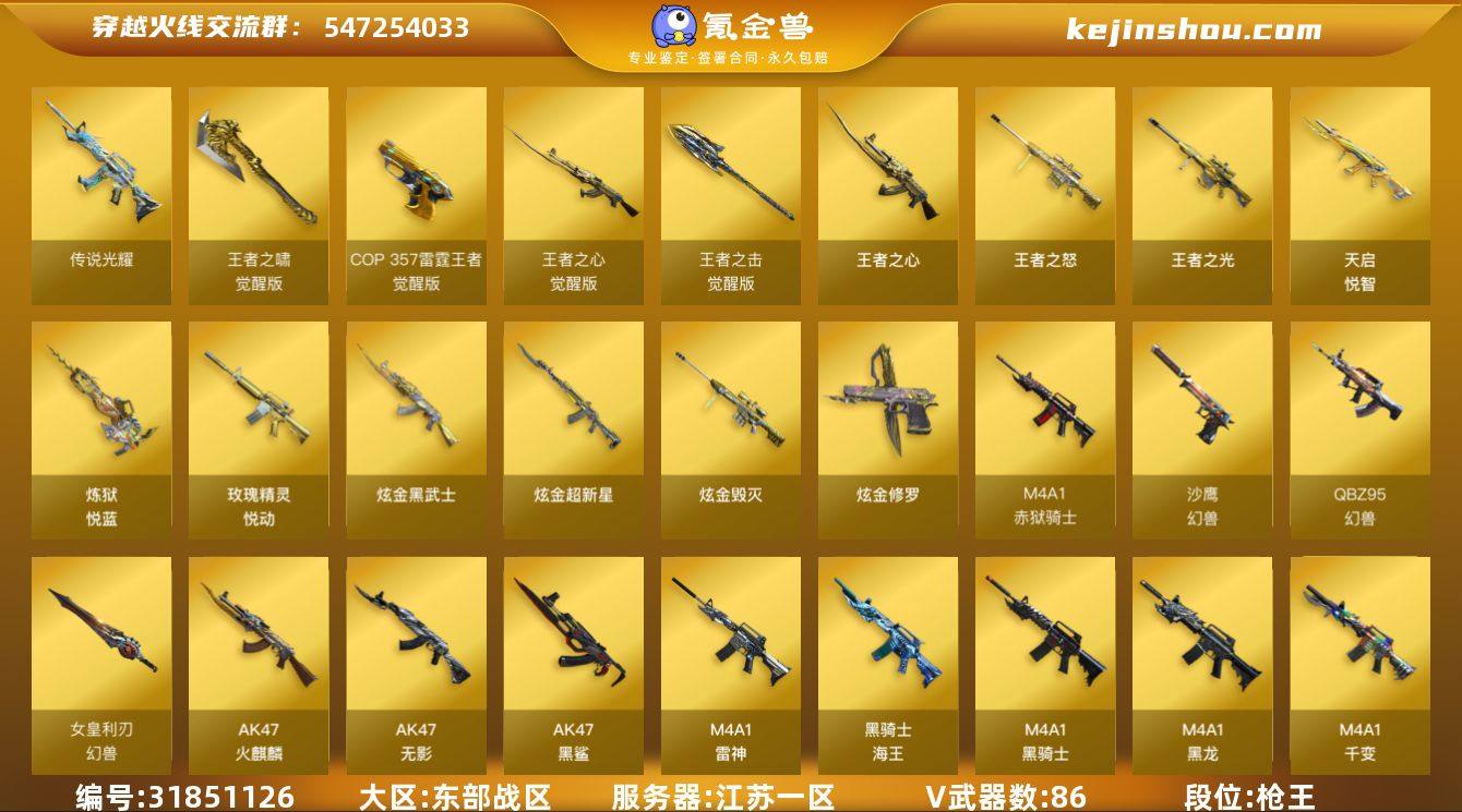 江苏一区-89V-20王者-4炫金 【传说武器】:传说光耀 【热门武器】:传说光耀,QBZ03-金色蔷薇,HK417-朱雀,M200-幻神,死亡之眼*4,金色小号,M4A1-黑骑士*3,汤姆逊-烈龙*8,RPK-盘龙*6,加特林-炼狱*2,斯泰尔-蝴蝶,羊驼玩偶,沙鹰-修罗*4,高爆手雷-幻兽*5 【王者炫金武器】:天启-悦智,玫瑰精灵-悦动*2,王者之心,王者之光,王者之怒,炼狱-悦蓝*2,炫金武士,炫金超新星,炫金毁灭,炫金修罗 【音效卡】:M4A1-黑龙音效卡,M4A1-黑骑士音效卡,Barrett-毁灭音效卡 【皮肤】:裁决-流光秘银,雷神-能量核心,雷神-荣耀之魄,火麒麟-AG战队皮肤,火麒麟-百城,毁灭-星空,毁灭-风暴*2,黑龙-能量核心,无影-暗月,天启-暗月,战神-粉色甜心皮肤*3,战神-紫绶金章皮肤*2,战神-流金岁月皮肤*2,天龙-能量核心*2,修罗-能量核心*2,修罗-星空,天神-暗月 【角色】:葵,樱,蝴蝶,王者-瞳-闭月羞花,王者之瞳,修道士,暗夜-X,初恋灵狐,风暴女,嘉年华灵狐,零-水下丽影,灵狐者-X,灵狐者-七夕宝贝,龙儿-小淘气,潘多拉-X,潜龙队-X,青霞仙子,蜀雪,铁骑荣耀,雪莉杨-摸金校尉,影武者-X 【人偶武器】:斯泰尔-蝴蝶,AWM-灵狐-15周年嘉年华,COP-旗袍,M4A1-刀锋,迷你深渊冰龙,迷你裂空之翼*3,迷你牛牛,深渊终结者手雷*2,闪光弹-小乔,迷你艾比 【暴走生化】:死亡之眼*4 【挑战大师】:致命乱世-超越Max,神圣爆裂者III,冰龙粉碎者-白马银枪,VEPR-12-金魔,激光毁灭者III,阐释者III*2 【英雄级武器】:M4A1-千变,AK47-火麒麟,M4A1-黑龙,M4A1-雷神*2,M4A1-黑骑士*3,AK47-无影*2,AN94-超新星,AK47-黑鲨,HK417-朱雀,M4A1-玫瑰精灵,QBZ95-幻兽,QBZ03-金色蔷薇,王者之心-觉醒版,AK-47-猩红传说*4,AK47-B-战神,黑骑士-海王,AWM-天龙*2,Barrett-毁灭*2,Barrett-极光,AWM-裁决,M2...