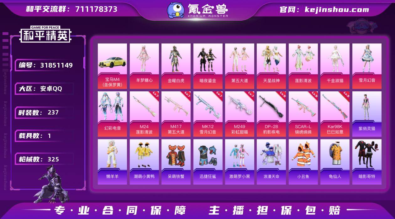 安卓 手Q-9粉装-9特效枪-1载具-1粉色飞行器-101165热力值-14王牌印记-237套装-325枪皮 【热门品类】:套装-浪漫天命,套装-小丑鱼,套装-龟仙人,套装-潮萌小黄鸭,套装-暗影哥特 【粉色套装】:粉装-金曜白虎,粉装-暗夜鎏金,粉装-第五大道,粉装-天星战神,粉装-莲影清波,角色-千金淑猫,粉装-雪月幻音,粉装-幻彩电音,角色-羊梦糖心 【粉色枪皮等级】:SCAR-L-锦绣绵绵(五级),UMP45-萌骑冒险(五级),Kar98K-巳巳如意(五级),M24-莲影清波(七级),Mk14-福马献瑞(二级),M417-第五大道(七级),MK12-雪月幻音(七级),M249-彩虹甜喵(七级),DP-28-豹影疾电(五级) 【粉色载具】:宝马M4(圣保罗黄) 【粉色枪皮】:SCAR-L-锦绣绵绵,UMP45-萌骑冒险,Kar98K-巳巳如意,M24-莲影清波,Mk14-福马献瑞,M417-第五大道,MK12-雪月幻音,M249-彩虹甜喵,DP-28-豹影疾电 【粉色飞行器】:炫彩糖果飞行器 【粉色降落伞】:精灵迷巫降落伞,神秘黑猫降落伞,银刃赛罗降落伞,暗夜玫瑰降落伞,风花雪月降落伞,灵感创作师降落伞,彩虹甜喵降落伞,千面幻镜降落伞,暗夜鎏金降落伞,第五大道降落伞,纯梦嫁纱降落伞,闲梦青缨降落伞,萌物绒绒降落伞,莲影清波降落伞,镜光幻境降落伞,蜜语绒猫降落伞,江南烟雨降落伞,霓虹漫游降落伞,精灵梦叶罗丽降落伞,未来领航者降落伞,樱桃泡泡降落伞,桃粉嫣然降落伞,雪月幻音降落伞,智耀战神降落伞,双重狂想降落伞,荧海星豚降落伞,炫彩糖果降落伞 【稀有套装】:套装-龟仙人,套装-绒宝小鹅,套装-巳巳如意,套装-小鸟芋圆,套装-炫彩糖果,套装-马上有钱,套装-雏菊兔兔,套装-萝兰蝴蝶,套装-小熊娃娃,套装-火种守卫者,套装-糖糖葫芦,套装-青团波波,角色-都市丽猫,套装-燕燕于飞,套装-鱼渊荷华,套装-镭金极速,套装-风舞幻音,套装-樱梦幻音,套装-粉恋花,套装-...