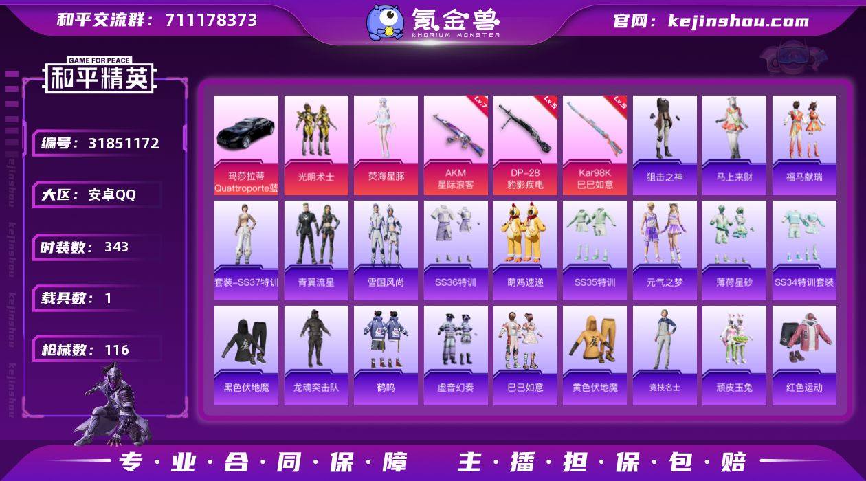 实名:可二次实名 是否支持人脸包赔:不支持 粉装数量:2 特效枪数量:3 载具数:1 时装数:343 枪械数:116 光明术士,荧海星豚 七级AKM-星际浪客,五级DP-28-豹影疾电,五级Kar98K-巳巳如意 玛莎拉蒂Quattroporte(夜幕蓝) 狙击之神,马上来财,福马献瑞,SS37特训,青翼流星,雪国风尚,SS36特训,炫彩糖果,萌鸡速递,SS35特训,元气之梦,薄荷星砂,SS34特训套装,冰川特警,缤纷果语,冰河战士,白色伏地魔,长空猛禽,潮流炫酷,电音精灵,飞驰魅影,粉红小猪,格斗先锋,光之冒险,鹤鸣,湖蓝色名流,黑色伏地魔,黄色伏地魔,黄色运动,红色运动,幻世战舞者,橘黑制服,娇憨猪猪,竞技达人朋克,竞技名士,龙魂突击队,猎鹰,蓝色运动,猛禽,魅力单车,麻辣教官,萌趣咩咩,卖崽青蛙,霓虹极客,牛气冲天,牛气满满,青年教官,青涩时光,青玉碎影,深蓝色名流,森林游猎者,SS18特训,SS19特训,SS20特训,SS21特训,SS22特训,SS28特训,SS31特训套装,SS32特训套装,SS33特训套装,巳巳如意,探宝勇士,天籁歌者,特训学院,甜心亚梦,完美偶像,顽皮玉兔,夏日音浪,雪山精英,虚音幻奏,异彩先驱,耀粉歌者,音速流光,玉兔迎春,乐音,异域银装,灼焰舞者 炫彩糖果飞行器,炫彩糖果降落伞,洛神天依降落伞,星际浪客降落伞 卖家说:王者pub g连体,王者贵族五有基德,Pub g有四级龙吟妹控加马皮
