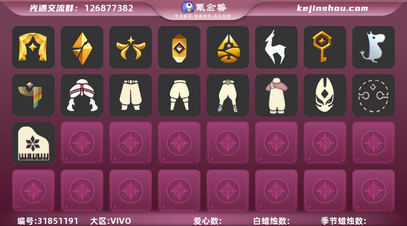 账号类型: 邮箱账号 季节已毕业: 表演季,破晓季,欧若拉季,夜行季,追忆季,拾光季,归巢季,九色鹿季,筑巢季,二重奏季,姆明季,彩染季,青鸟季,双星季,迁徙季 完成地图: 晨岛,云野,雨林,霞谷,暮土,禁阁 珍稀物品: 白枭,透明蝶翼斗,彩虹围巾 礼包: 巫师,围巾,兔子,新年裤,暗彩装扮 裤子: 武士裤,搓澡巾,妮妮裙子,蓝绿裤,飞天裤,筑巢季·裤子,青鸟尊贵蓬头裤子 面具: 夜行毕业面具,黄眉企鹅面具,辉光羚羊面具 面饰: 黑框眼镜,青鸟毕业面饰 项链: 围巾 发型: 归巢毕业发型,若笠,虚荣,留辫蘑菇头,飞天盘发 头饰: 牛仔帽,蓝色音乐会,平顶帽 斗篷: 海洋斗,绿芽,粉红绒毛斗篷,遥鲲斗篷,燕尾斗篷,冥龙斗篷,彩染围巾斗篷,青鸟毕业斗篷 配饰: 雨伞,筑巢季·小手办,高音钢琴,姆明抱枕,小红伞,相机,二重奏挂画,鲲灯 亮点: 【优质装备】:表演季,白枭(帝企鹅发),武士裤,青鸟尊贵蓬头裤子(蓝色燕尾服),破晓季,透明蝶翼斗,欧若拉季(欧若拉),归巢毕业发型(五塑彩羽发),筑巢季·小手办(光之子试衣),高音钢琴(白色高脚钢琴),夜行季,追忆季,妮妮裙子(妮妮长裙),牛仔帽(西部帽),姆明抱枕,小红伞(姆明红伞)(姆明大伞),相机(季卡相机),拾光季,彩虹围巾(五塑彩带斗),归巢季,九色鹿(九色鹿季),蓝绿裤(高领舞服),飞天裤(柔缎花边连)(九色鹿丝带裤),围巾(肩带),筑巢季,二重奏季,二重奏挂画(合奏挂画),姆明季,筑巢季·裤子(设计师长袍),夜行毕业面具(棕熊面具),黄眉企鹅面具,黑框眼镜(粗框眼镜),留辫蘑菇头,粉红绒毛斗篷(绒毛斗篷),遥鲲斗篷(双翼遥鲲斗),燕尾斗篷,冥龙斗篷,鲲灯(追忆之书),辉光羚羊面具,彩染季,飞天盘发(九色鹿丸子头),青鸟季,青鸟毕业面饰(青鸟面饰),青鸟毕业斗篷(青鸟斗篷),双星季,围巾(小王子斗篷)(小王子围巾),暗彩装扮(彩虹武士裤),巫师(巫师帽),新年裤(瑞气服饰),晨岛,云野,雨林,霞谷,墓土(暮土),禁阁,若笠(箬笠),兔子(玉兔头饰)(...